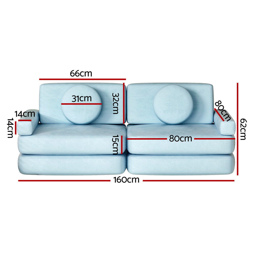 For a practical piece of furniture that doubles as a creative play experience, you'll love the Artiss Play Couch. With its modular design, the couch can be rearranged into a multitude of shapes to relax, hide and play. The set features 4 base cushions in 2 foldable pieces, 2 trapezoid cushions, 2 rectangular cushions and 2 round cushions, perfect for building and rebuilding. The couch is made from extra thick seat cushioning wrapped in premium velvet upholstery with a luxurious touch. The zippered cover can be easily removed, making cleaning simple and convenient. Soft and wear-resistant, your family will love the fun and frivolity of the Artiss Play Couch.