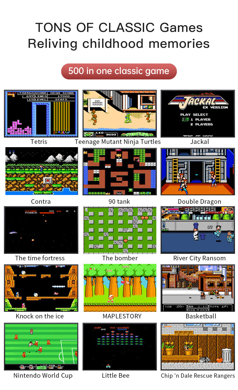 Relive your childhood memories with this 500-in-1 retro handheld game console. Featuring a vibrant display, classic games, and dual controllers for multiplayer fun, it is the perfect gift for gamers of all ages.