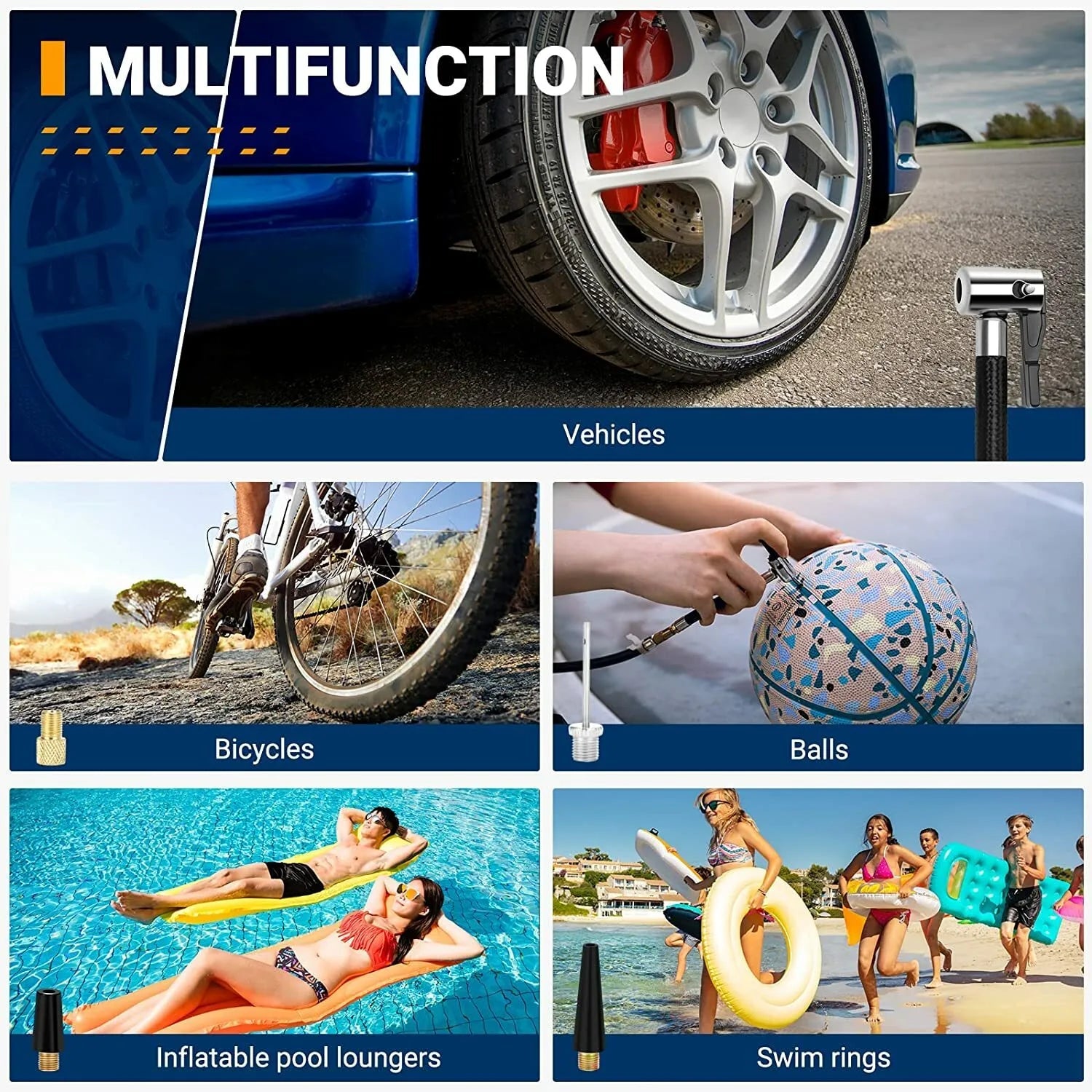 Easy to Read tire Pressure Gauge:The tire inflator is Equipped with a large high-precision and bright display that will help you to calculate the required values. Bright LED Flashlight:This air compressor has a built-in bright and long-lasting LED flashlight. which allow easy operation or making quick repairs in the dark. Multiple Uses: The portable Auto Tire Pump comes with a 10ft power cord and inflatables adaptors (3 additional nozzles), makes it perfect for cars, trucks, motorcycles, bicycles, inflatable boats, sports balls, air mattress and other inflatables.