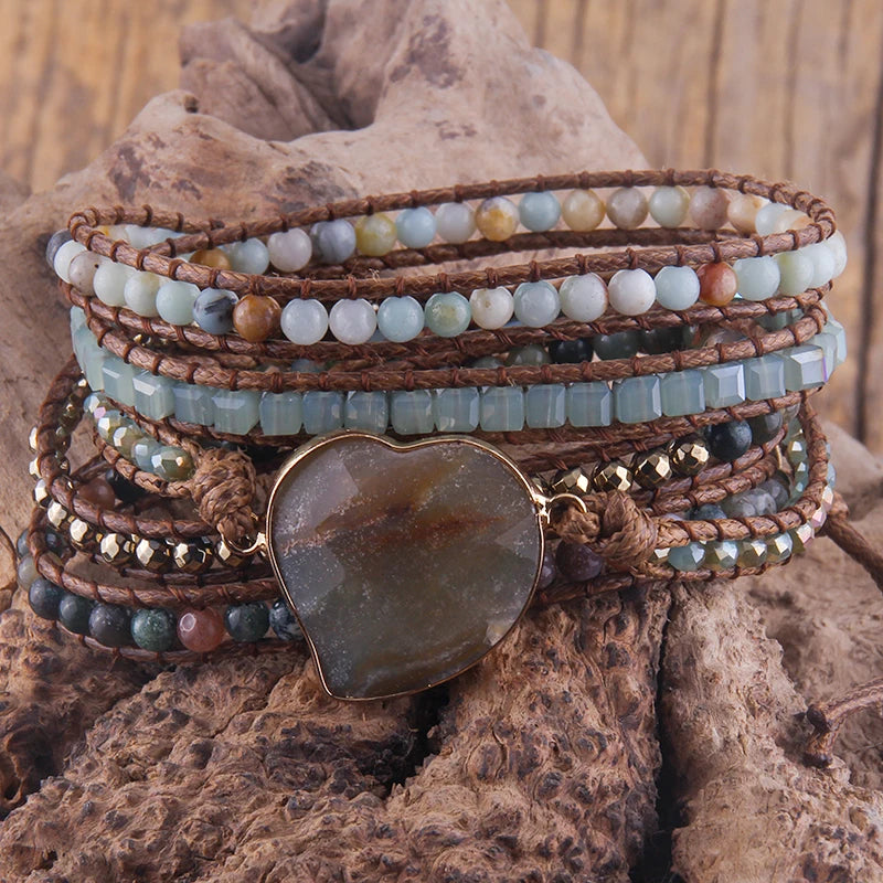 Dive into the cosmic currents with this handmade hippie bracelet, where the earth's treasures meet the beat of your heart. Handcrafted with care and adorned with an eclectic blend of natural stones, each one a whisper from the depths of the earth's soul, paired with a charming heart emblem. Handmade in the soothing hues of amazonite, it echoes the tranquil flow of the river and the wisdom of ancient forests. Wrap it around your wrist and dance to the rhythm of the universe, embracing the magic of every moment.