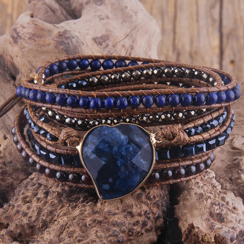 Feel the groove with this handmade hippie bracelet, a fusion of earthy vibes and heartfelt charm. Crafted by hand and adorned with an eclectic mix of natural stones, each one a testament to the beauty of our planet, paired with a whimsical heart charm. Handmade in deep shades of blue, it echoes the mysteries of the cosmos and the depths of the ocean. Let it adorn your wrist, a reminder to flow with the rhythms of nature and embrace the magic of the universe.