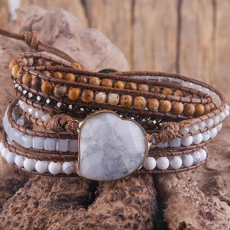 Embrace the purity of the universe with this handmade hippie bracelet, where the essence of nature intertwines with heartfelt charm. Crafted by hand and adorned with a medley of natural stones, each one a unique expression of the earth's beauty, paired with a delightful heart charm. Handmade in serene shades of white, it echoes the tranquility of untouched snow and the purity of a clear sky. Wrap it around your wrist and connect with the peaceful energy of the cosmos; allowing its gentle whispers to guide your soul.