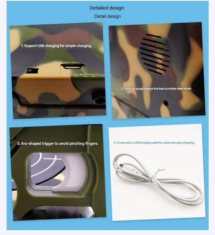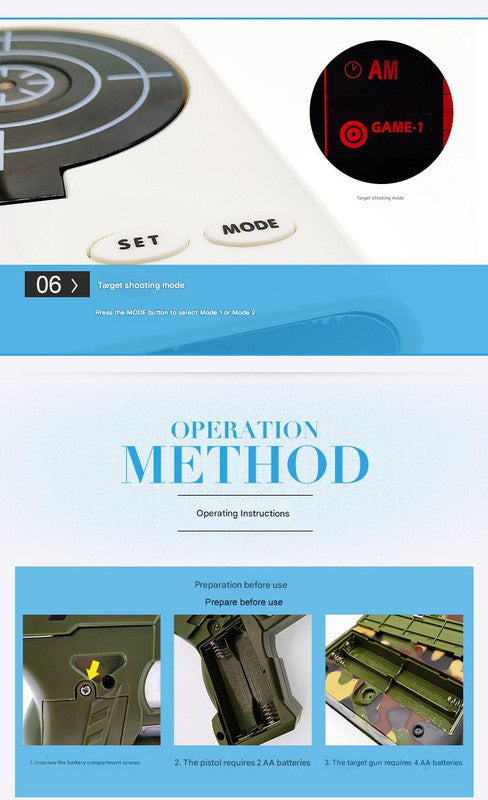 Batteries are NOT included unless specified. Some models may feature USB charging for the base unit (USB cable might be included in such cases), while the gun remains battery-operated. This product contains an infrared emitter in the gun; do not aim directly at eyes or face. This is a toy alarm clock and the "gun" is a toy infrared emitter, not a real firearm. Adult supervision may be appropriate for younger users. Ensure correct battery polarity when inserting batteries. The infrared gun requires a line of sight to the target for accurate deactivation. This toy product is designed for amusement; its effectiveness as an alarm depends on user interaction.