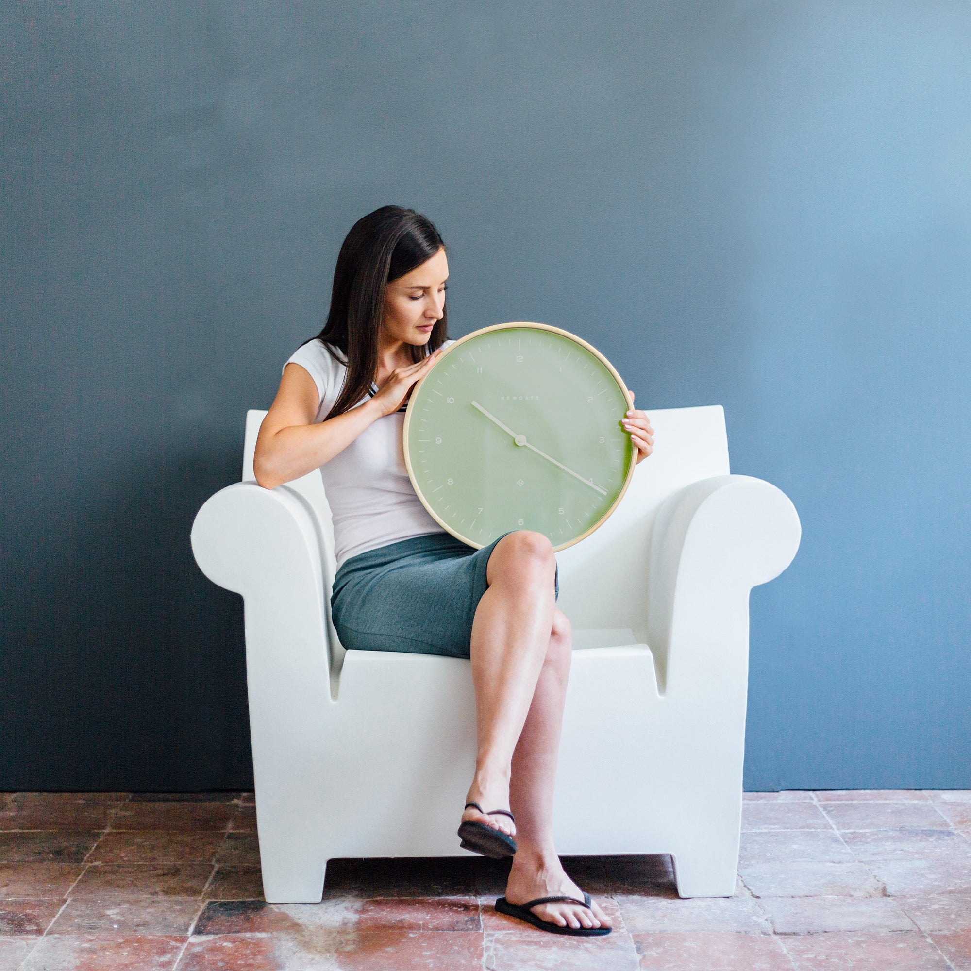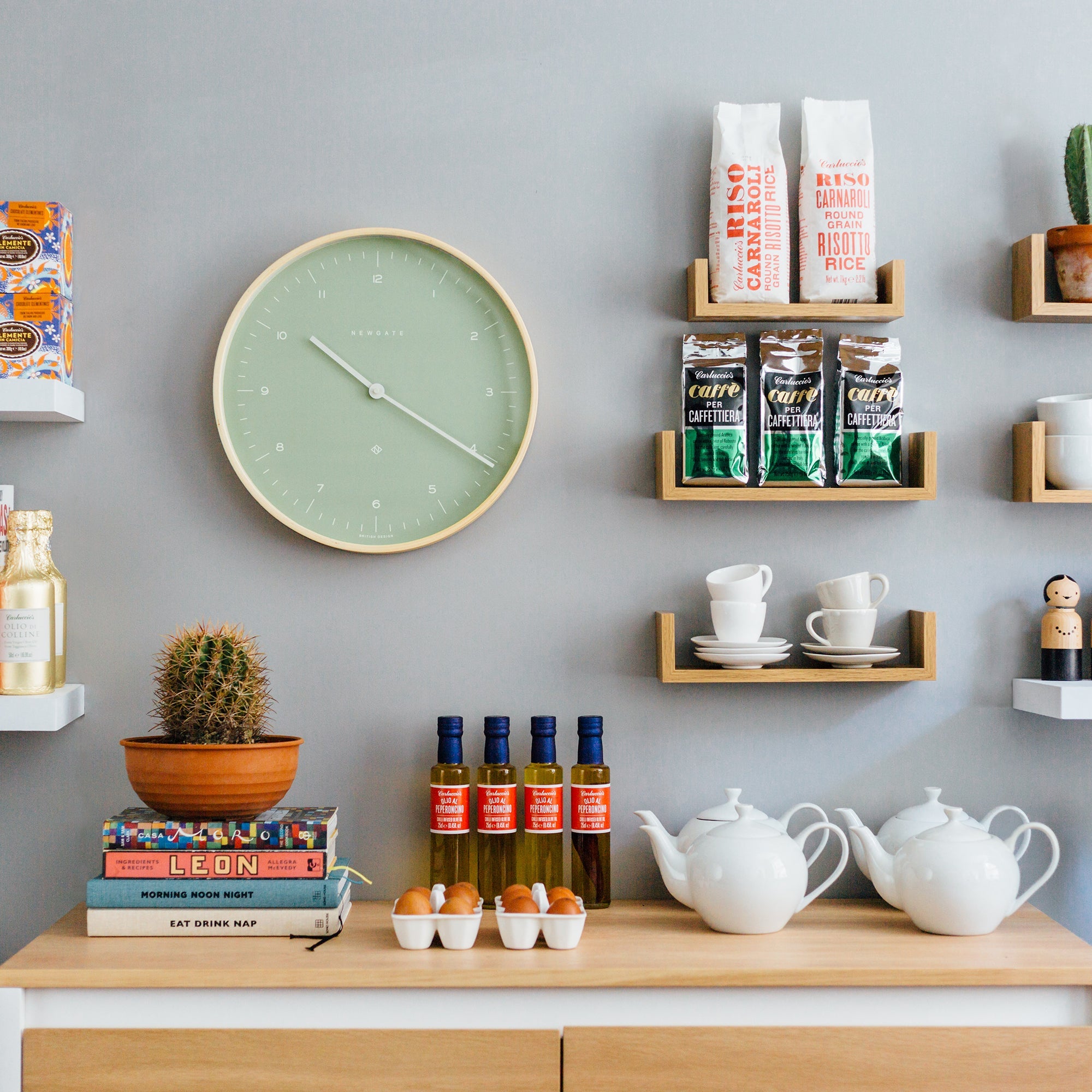 Newgate Mr Clarke Clock Pale Wood Bubble Green Dial 133 A modern Scandinavian-inspired wall clock with a pale plywood case and a contemporary Bubble Green dial with minimalist graphic numerals.