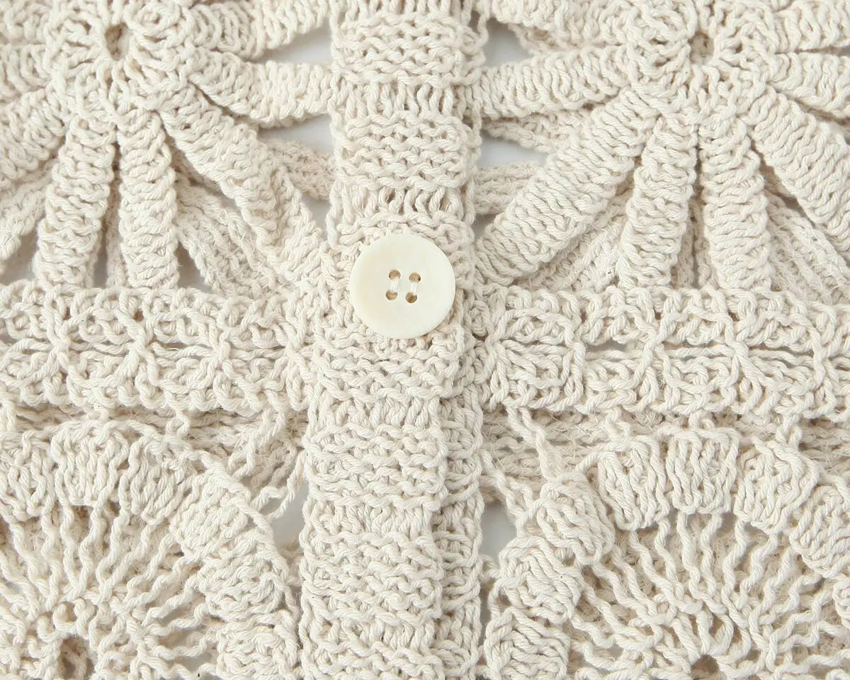 Turn heads at the beach or festival with this stunning Bohemian Hippie Two-Piece Set – a breathable, cotton-blend outfit featuring a hollow-out crochet design. This lightweight ensemble includes a short-sleeve V-neck buttoned top paired with high-waisted ankle-length pants, both designed with a relaxed fit and boho-inspired details.