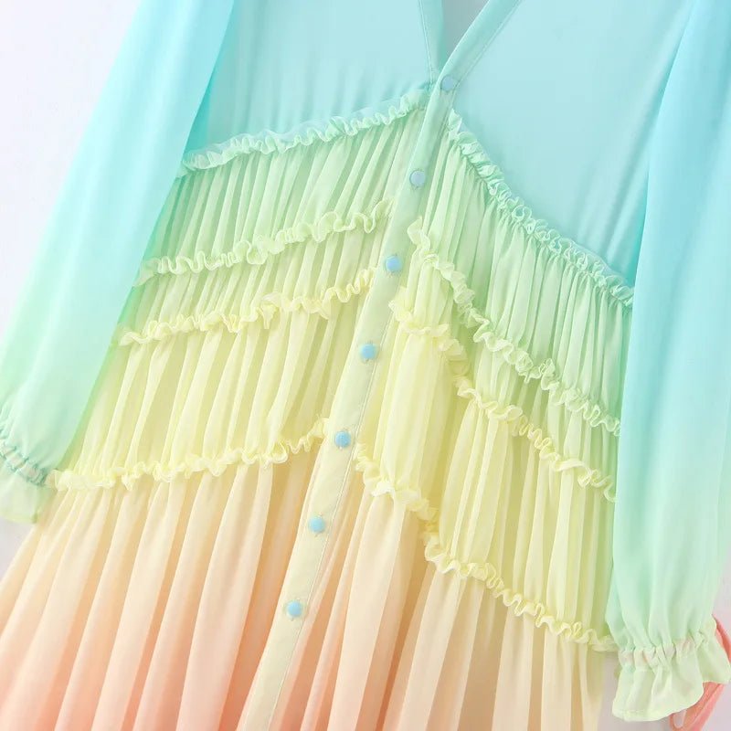 Design: Rainbow gradient patchwork, ruffles, tiered details