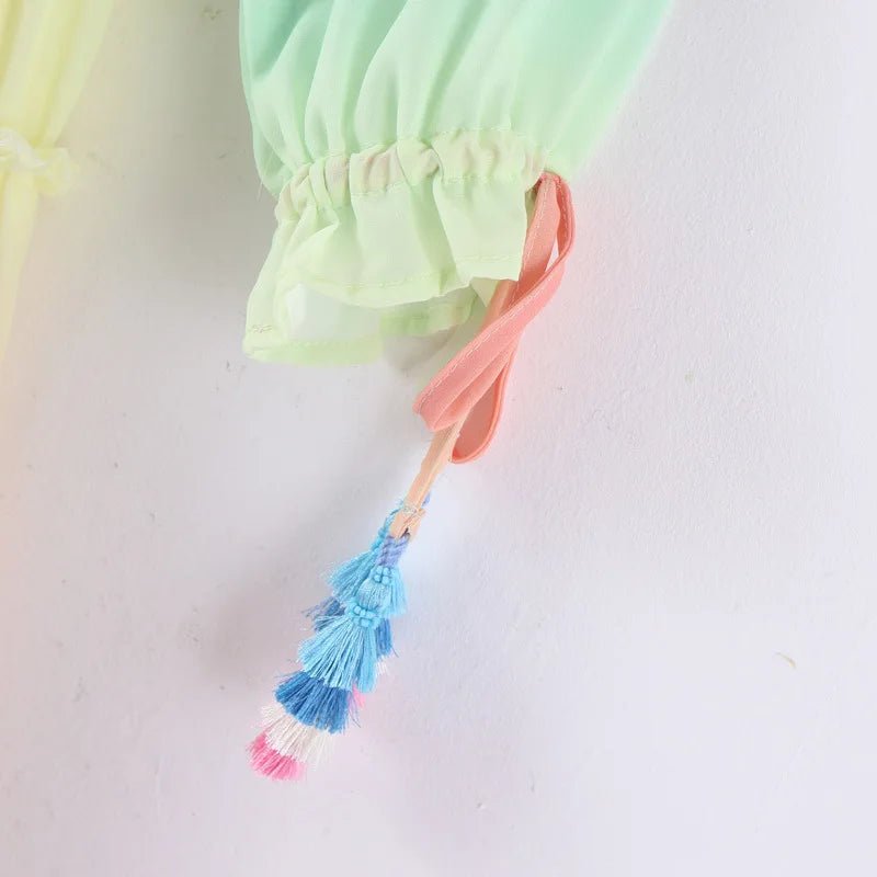 Turn heads with this stunning Bohemian Rainbow Maxi Dress, designed to bring a touch of magic to your wardrobe. Featuring a soft gradient rainbow colour palette, tiered ruffle details, and flowing lantern sleeves, this floor-length beauty is perfect for summer parties, festivals, beach days, or boho-chic events.