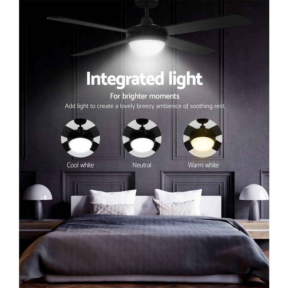 Gentle breezes, light drafts or high winds, the Devanti 52" Ceiling Fan is ever ready to meet your requirements easily. With three fan speeds, the contemporary-design ceiling fan also has a reverse cycle motor that can create downdrafts during summer or updrafts during winter for greater comfort. Its four high-quality wooden blades are pitched at an airflow-inducing 12 degree for more effective wind creation. Plus, its energy-efficient 70W motor operates ever so quietly. Also featured is built-in memory-enabled LED lighting that can bring on a cool white, warm white or neutral lighting ambience to go with the fanning function. Better still, the fan can be set for up to 8 hours of timed operation and the handy remote control makes this fan a breeze to use from anywhere in the room. The ceiling fan also comes with all the accessories for an easy installation including an extension rod. Available in black, white or silver colour to match your decoration easily.