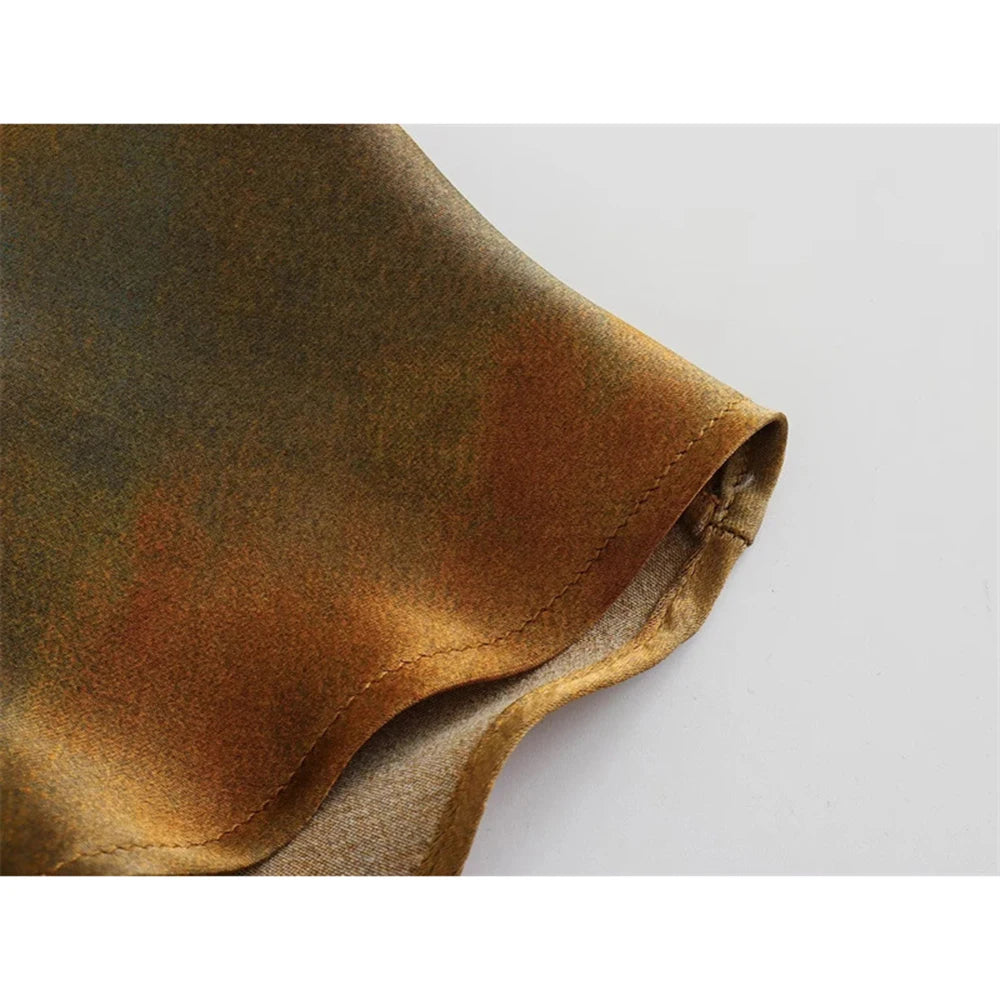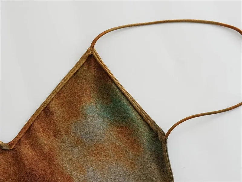 Embrace earthy elegance this summer with this stunning brown tie-dye dress, featuring a backless design and high-waisted, slim-fit silhouette. This A-line dress is crafted from lightweight polyester, making it a breathable choice for warm weather. Its V-neckline and spaghetti straps add a delicate touch, while the mid-calf length and casual style make it perfect for relaxed outings or beachside adventures. With no high-concern chemicals, this dress offers comfort and style you can feel good about. Available in sizes XS to L: