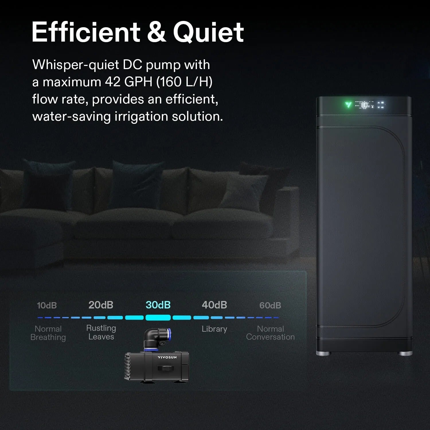 The 42 GPH pump operates quietly while delivering consistent water pressure to the four professional-grade drip emitters, ensuring even, waste-free watering at the root zone.