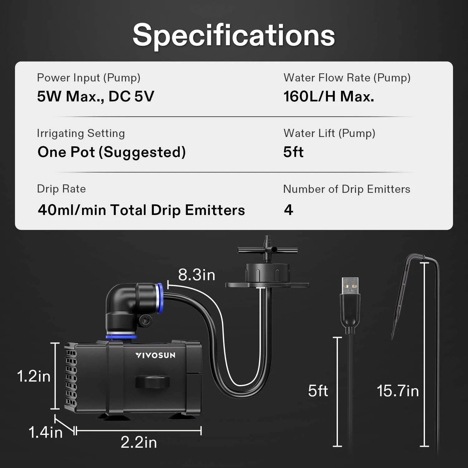 Designed for use with the Vivosun App, you can fully program watering frequency, flow rate, and duration to suit your plant’s growth cycle. Also works manually with any 5V 1A USB power adapter.