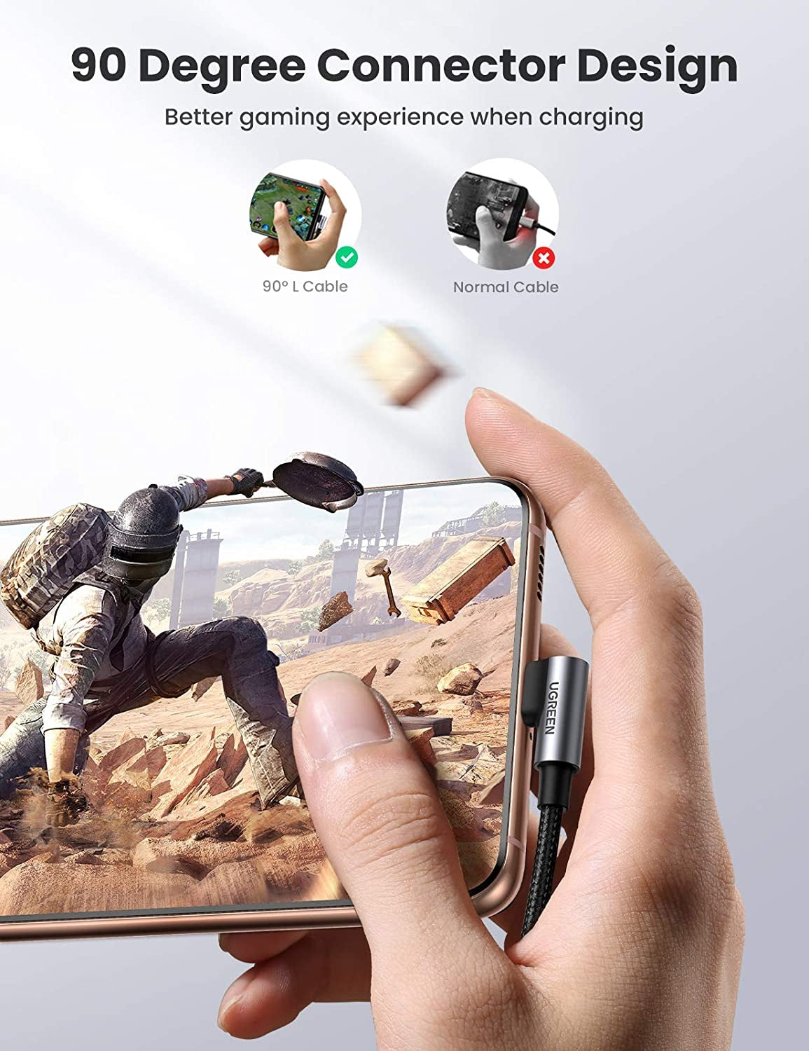 Right Angle USB C:UGREEN USB-C cable with an innovative 90 degrees L design. It's more convenient and more comfortable for playing games, watching videos, reading e-books when you lie on the couch or bed while charging. Safe and Quick Charge:This USB C to USB A cable supports Quick Charge 2.0 and 3.0, with max output up to 3A. It is fully compatible with Samsung Adaptive Fast Charging AFC and Huawei Fast Charging Protocol FCP, providing 5V 3A, 9V 2A or 12V 1.5A fast charge. With a built-in 56K resistor, this type c charger guarantees reliable conductivity and charging, protecting your cell phones from damage due to excessive current.
