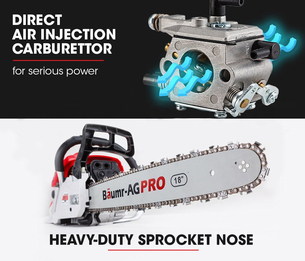 Make no mistake, this fast revving, perfectly balanced unit packs some serious punch, with Baumr-AG\'s premium range patented air injection carburettor delivering enough power to take on a whole variety of different jobs - from tree work, preparing firewood and sectioning those small to medium branches, to clearing overhang and removing bushfire hazards.