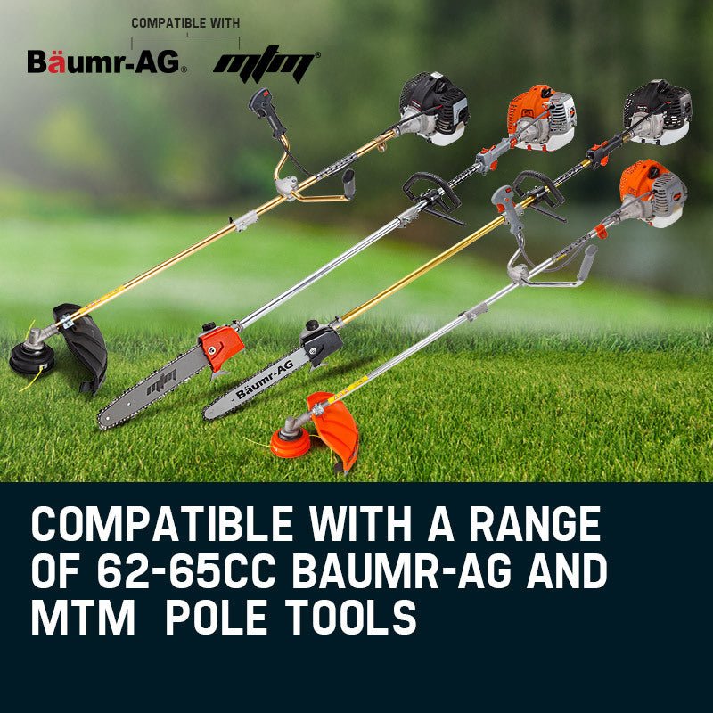 This mighty commercial-grade 65cc 2 stroke engine brings the grunt you need to power all your attachments for tackling serious gardening obstacles. It will continue to absorb all the inevitable knocks and blows power tools endure with its superior Maxi-Flex engine housing. There's no surprises with this item because its specifications and design have been developed to comply directly to the Baumr-AG and MTM range of garden pole tools. Be assured that it looks, feels and operates just like the original. Moreover, this unit is compatible with most other 25-65cc pole tool brands.