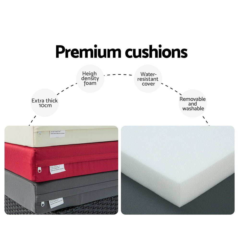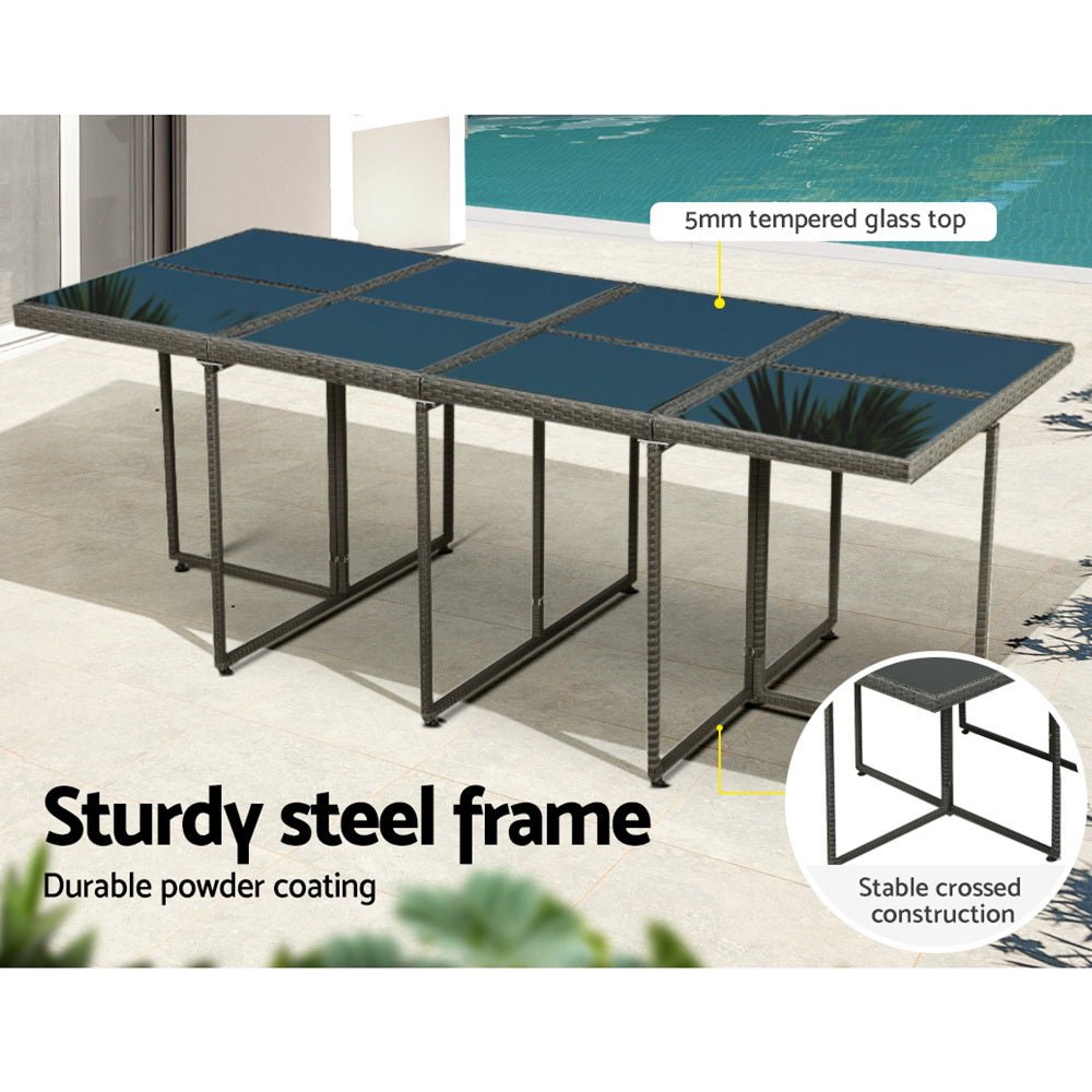 Looking to create a chic and gorgeous outdoor dining setting? The Gardeon 12-seater wicker outdoor dining set is a must purchase. It will liven up your outdoor space and help you achieve an elegant space where you can enjoy day and night and summer and winter. This 13-piece set comprises of eight chairs, four ottomans, and a large table. It boasts an integrated design that helps save space. The ottomans can be pushed under the chairs when not needed. All the seat and back cushions come with thick, high-density soft padding that ensures your comfort always. Additionally, the removable cushion covers are water-resistant to suit different seasons. Furthermore, our outdoor set features a lovely wicker weave for a touch of tropical charm, and the UV-resistant PE wicker with weather-resistant aluminium frame is suitable for all-season use. The large table with thick tempered glass top, durable frame, and stable cross construction ensures strength, durability, and stability. This set also comes with a bonus water-resistant storage cover that offer protection from all seasons. Our wicker outdoor dining set will withstand the test of time. You can create a praise-worthy spot with just a little creativity that will wow your guests. Shop it for your home today.