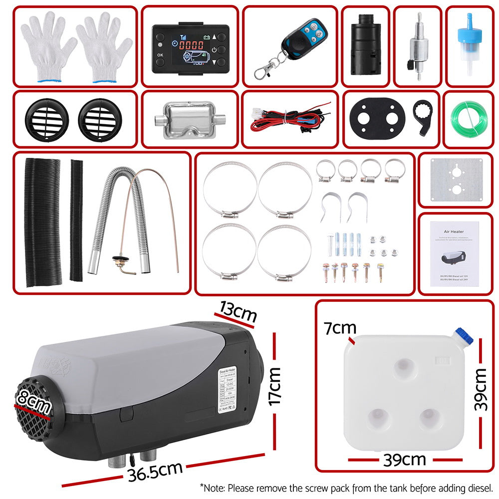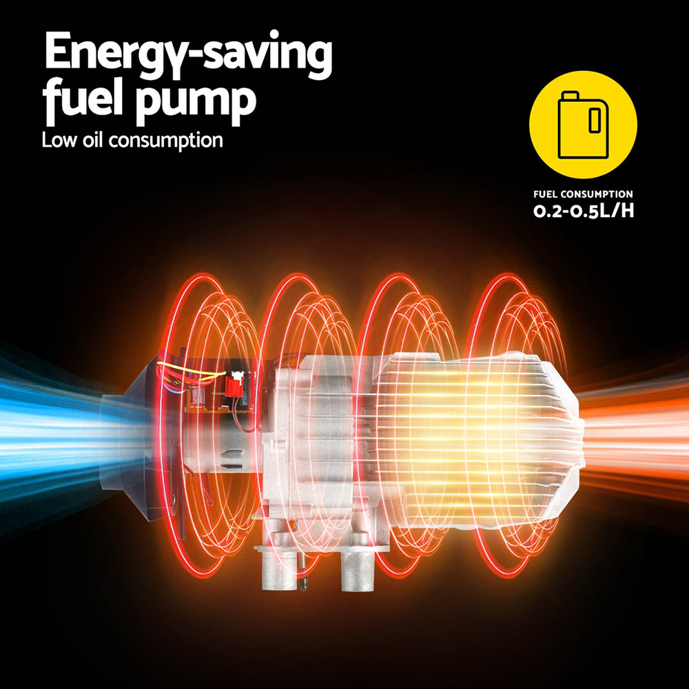 For fast and efficient heating on the go, the Giantz 5KW Portable Diesel Air Heater is a fantastic climate control solution that suits a wide variety of vehicles including caravans, motorhomes, trucks, camping trailers, buses, boats, machinery and more. With its low-noise operation, you can enjoy a peaceful environment while staying warm. The heater features a large 10L fuel tank, ensuring long-lasting heating without the need for frequent refills. Designed with energy-saving oil pump technology, this heater boasts low fuel consumption while providing a high heat output. The LCD monitor control allows for easy temperature adjustments, while the 30-metre long-distance remote control offers convenient heating from a distance. Compact and easy to install, this versatile heater will help you stay cosy and comfortable wherever you go.
