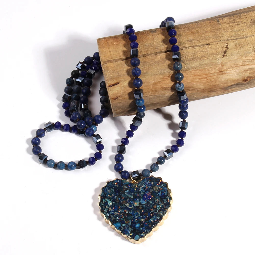 Feel the earthy vibes and embrace your inner free spirit with our Bohemian Styled Natural Stone Necklace! Crafted with love and adorned with a heart-shaped pendant in a mesmerizing dark blue hue, this accessory is a testament to your unique boho soul. The pendant, measuring 4.5cm carries the energy of the cosmos, bringing harmony and grounding to your every movement. Elevate your style with a touch of nature's beauty and let your spirit soar with our enchanting necklace!