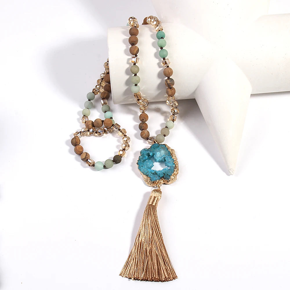 Embrace a bohemian spirit with our captivating tassel necklace, exuding a timeless charm with a hint of hippie flair. Crafted with meticulous attention to detail, each strand embodies a fusion of free-spirited style and sophisticated elegance. The centerpiece, an Amazonite Druzy Stone, adds a touch of natural beauty and serenity to the ensemble. Elevate any ensemble with this exquisite piece, effortlessly transitioning from day to evening with its versatile appeal.