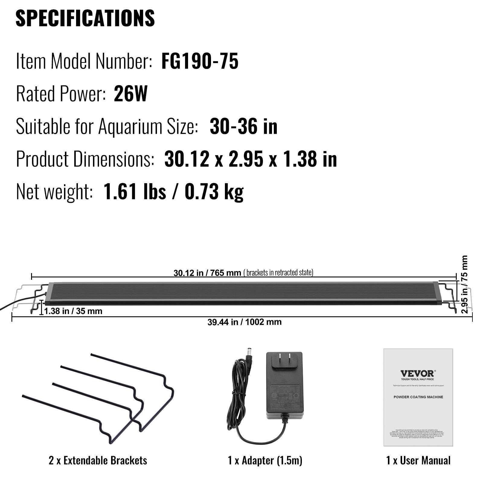 Designed for 30-36 inch aquariums, VEVOR aquarium LED lights have 2 extendable brackets with a maximum single-side extension of 4.7 inch and dual-side extension of 9.45 inch, making them easy to install on most glass or acrylic aquarium tanks with transparent hood/lid or no, with rims or rimless. Suitable for both novice and seasoned aquarium enthusiasts.