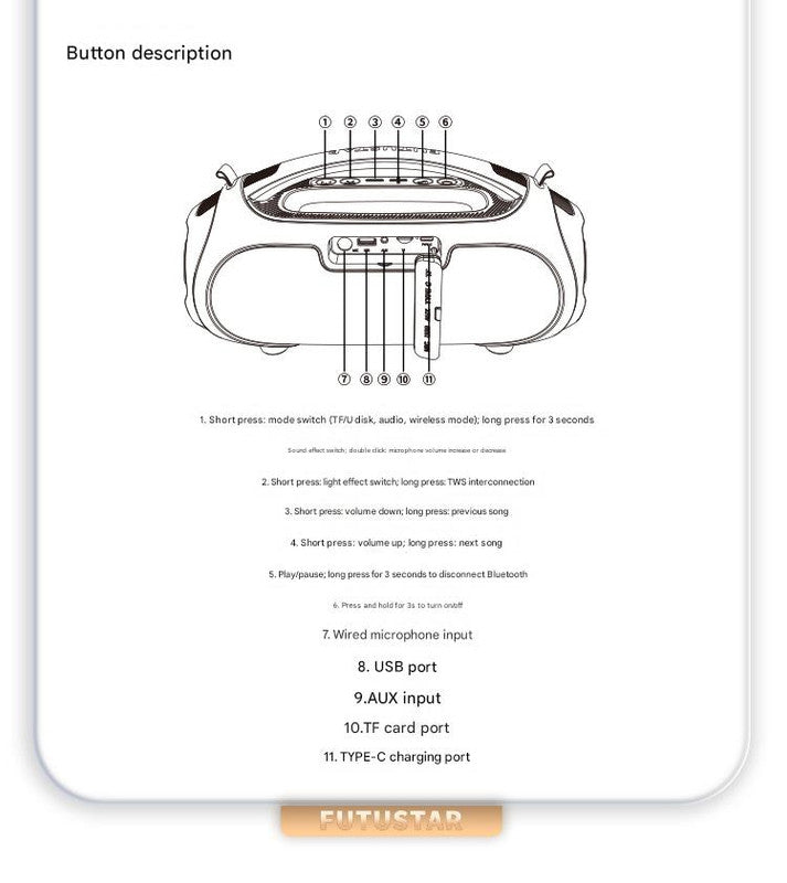 1. Mode Switch (M): Short press to switch modes (TF/U Disk, Audio, Wireless). Long press for 3 seconds for EQ sound effect switch (double click to decrease call volume - may be mislabeled or specific function).