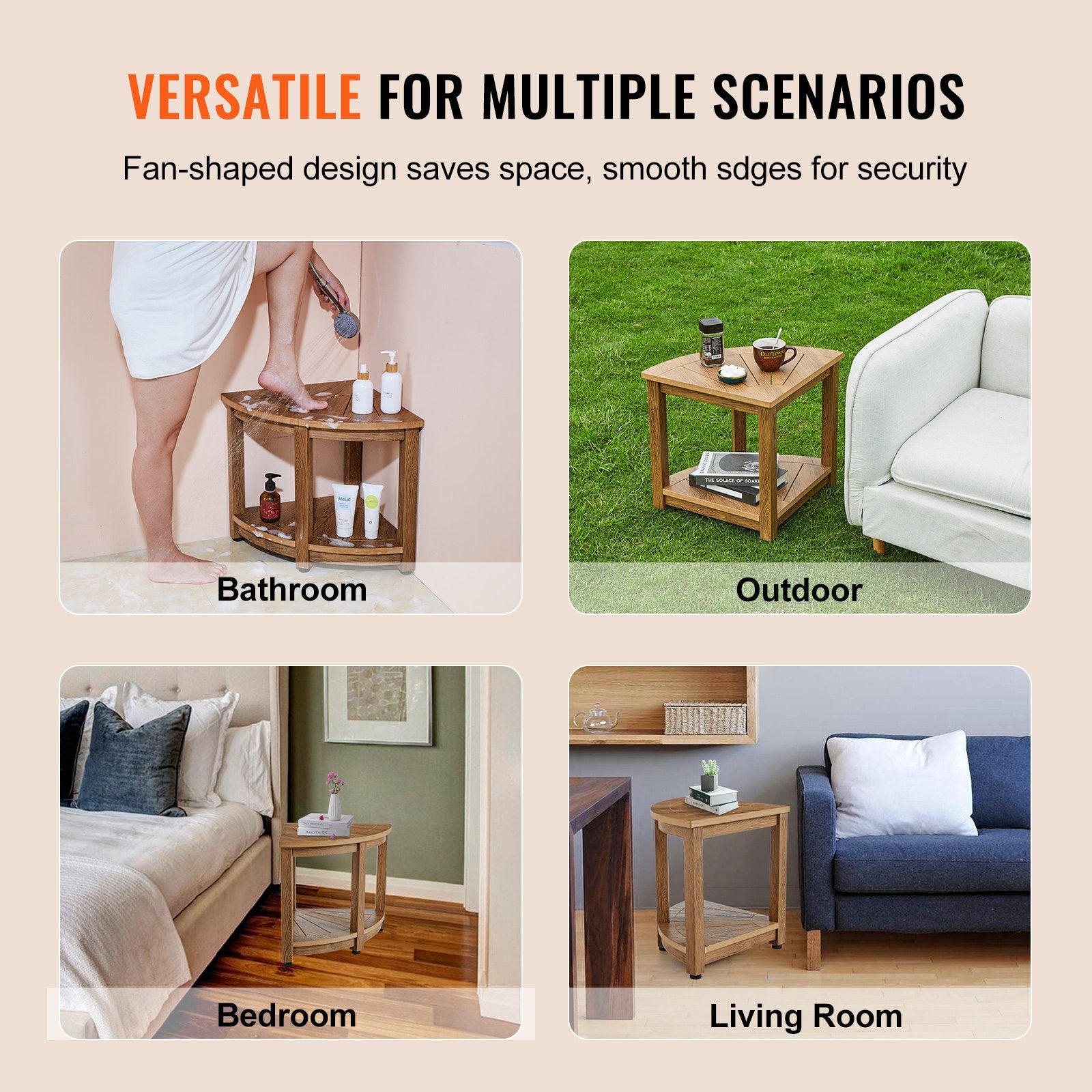 Double-layered design increases storage space, suitable for storing towels, shower gel, and other items, serving as a footrest or storage stool for convenient foot care and showering. Fan-shaped design fits snugly against walls, making efficient use of corner space. Suitable for use in bathrooms, outdoors, bedrooms, living rooms, and more.