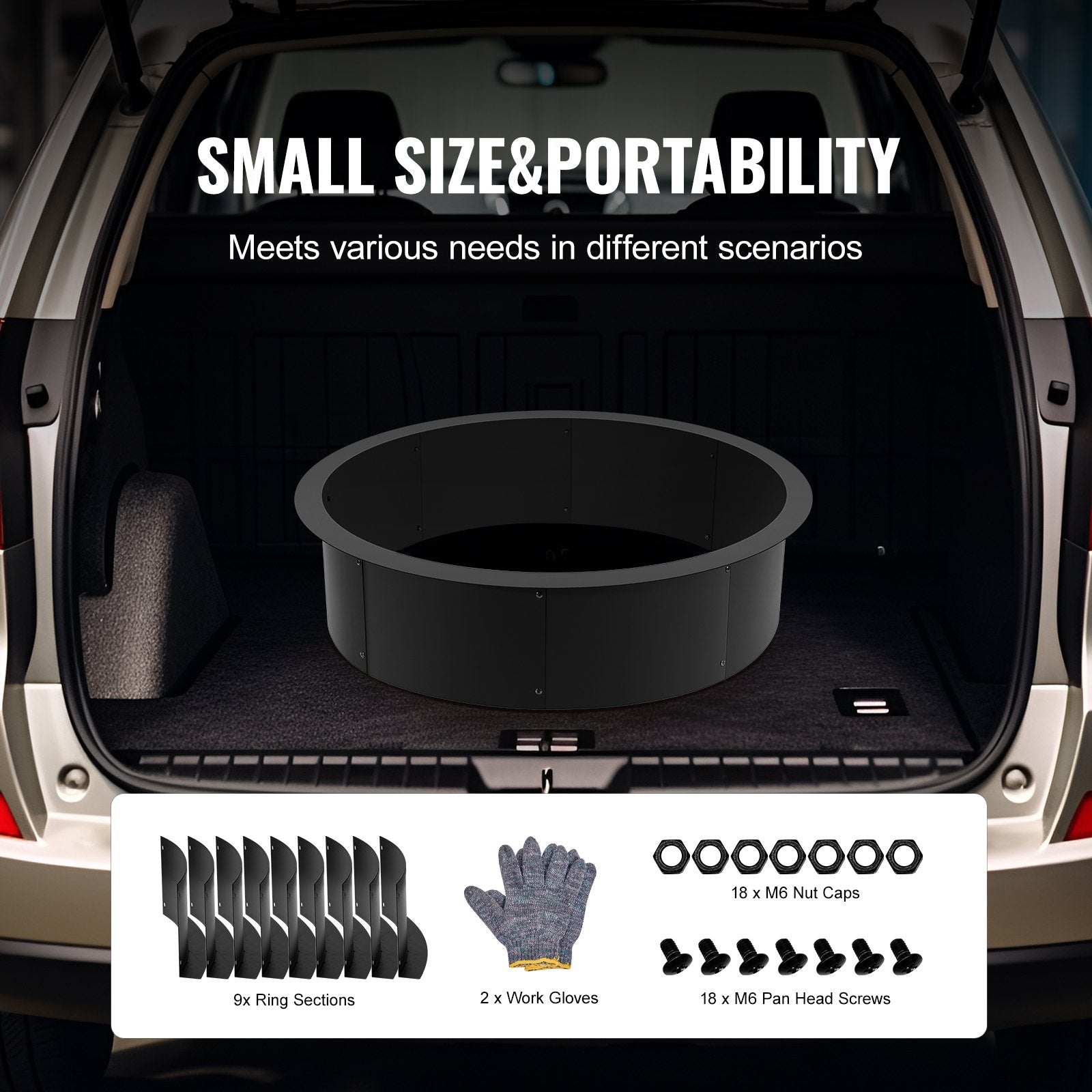 The outer diameter is 45 inches (1143 mm), inner diameter is 39 inches (990.6 mm), height is 10 inches (254 mm), and thickness is 0.06 inches (1.5 mm), providing ample external space to accommodate more firewood and charcoal, ensuring better airflow to facilitate thorough burning and ignite the campfire.