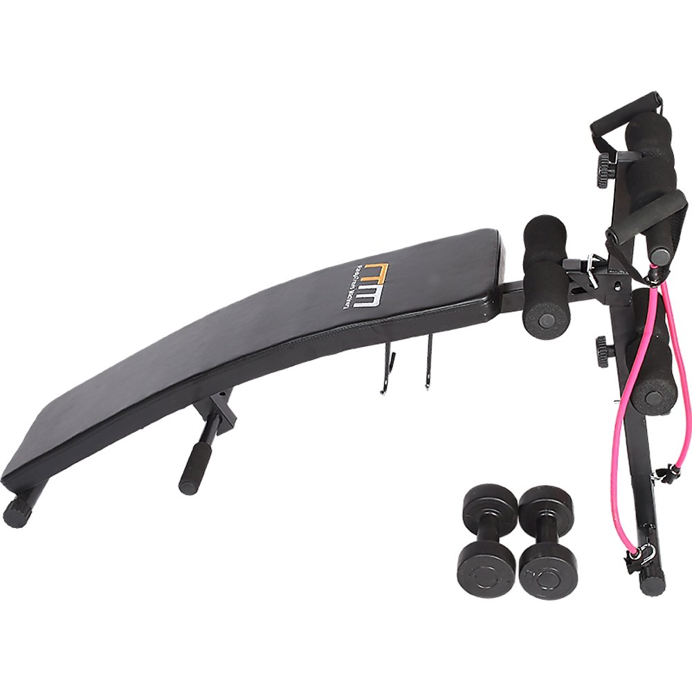 The incline sit-up bench is curved to ensure an intense core and upper body workout. The two 1.5kg dumbbells and pair of rubber cord resistance expanders will bring new strength and tone to your muscles. This must-have sit-up bench adjusts for height to enable maximum intensity and features adjustable knee, leg and foot foam roller bars to accommodate all body sizes.
