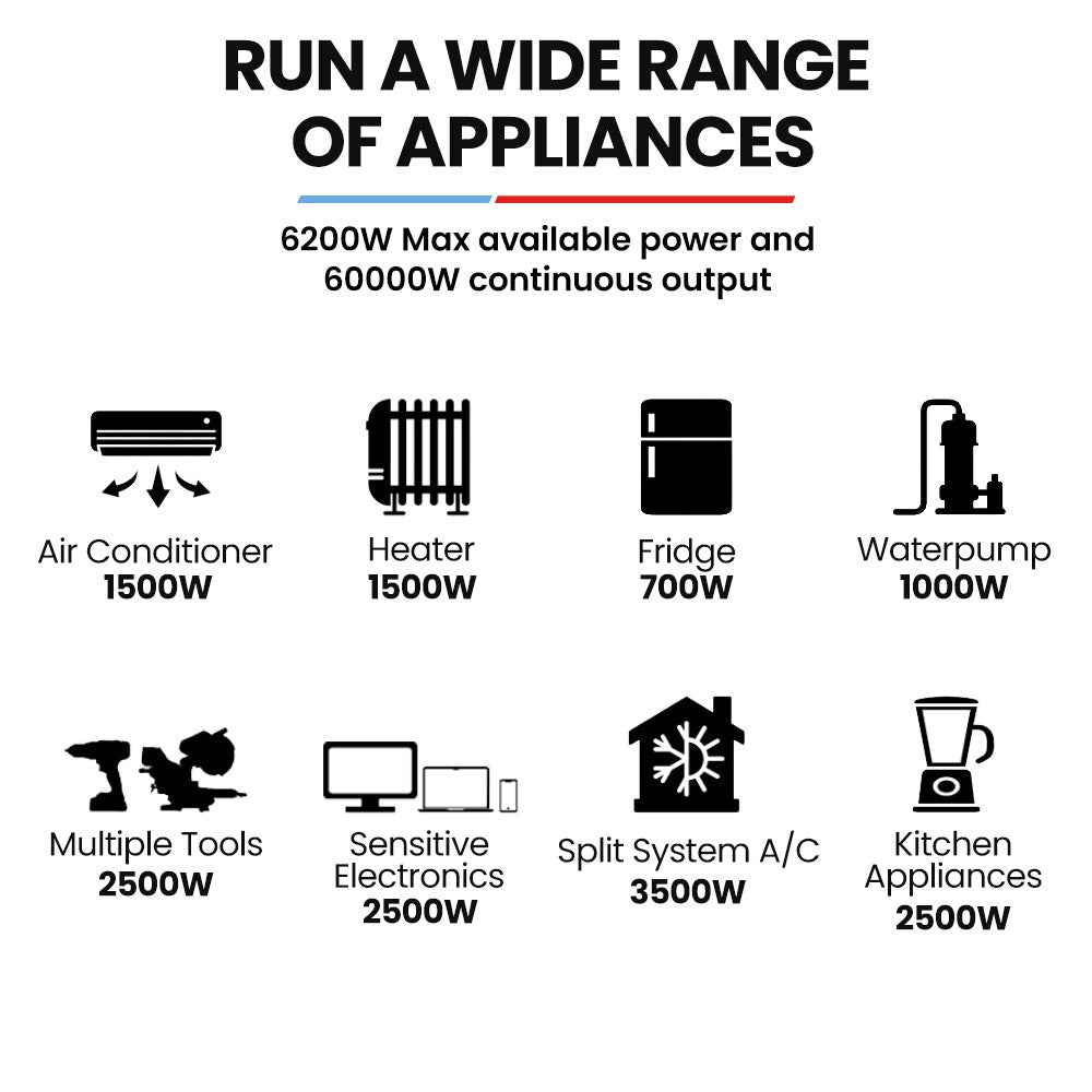 With a strong 298cc OHV engine producing 10HP, this generator pushes out up to 6200 starting watts and 6000 continuous watts of pure sine wave power. That means sensitive devices like laptops, TVs, and smartphones run smoothly, while heavy-duty appliances and power tools get the muscle they need.