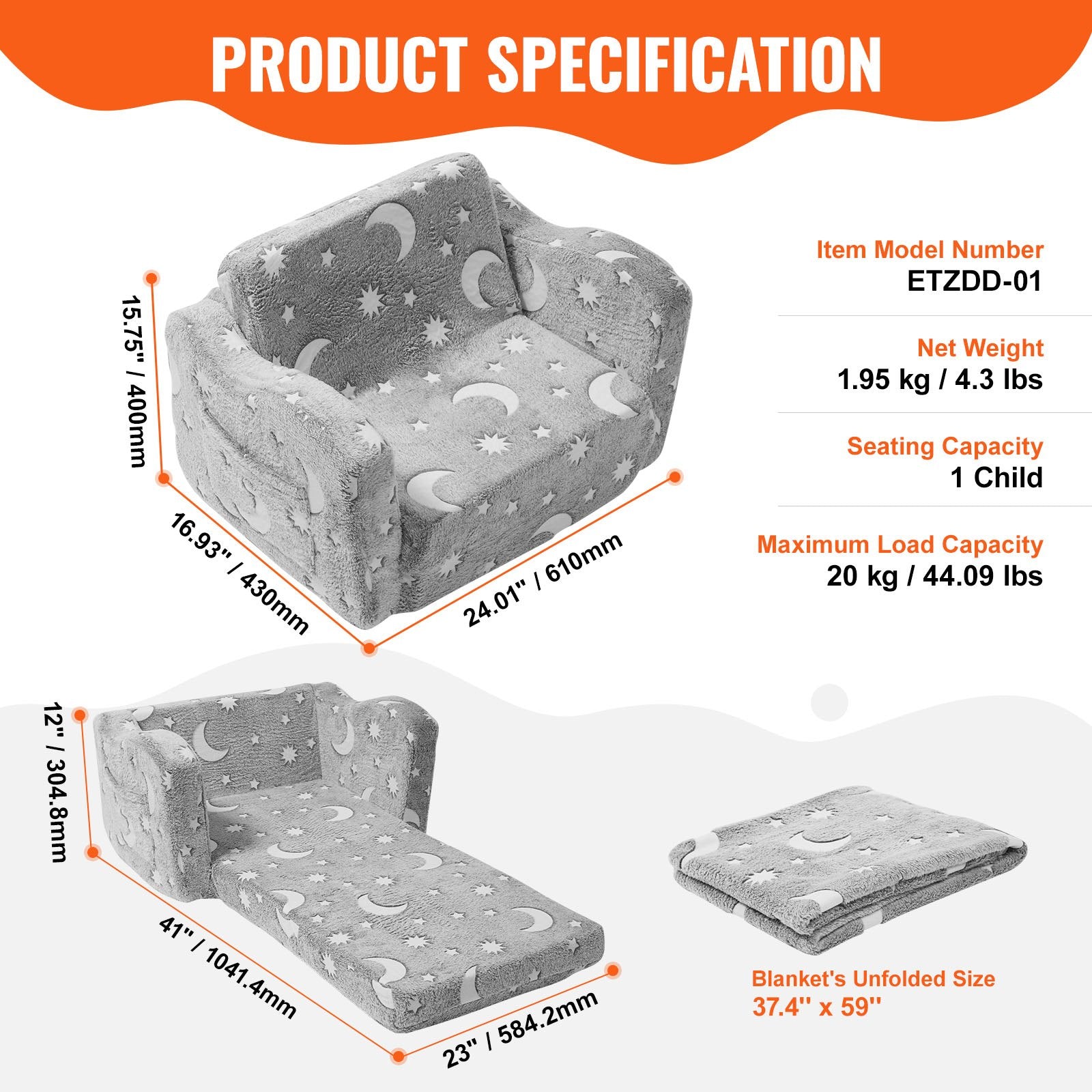 Utilizing luminous fabric, this toddler couch absorbs light during the day and releases it in the dark. The creative design of the glow-in-the-dark sofa cover and blanket can spark children's curiosity and exploration. Enhance the fun factor with this foldable kids couch.