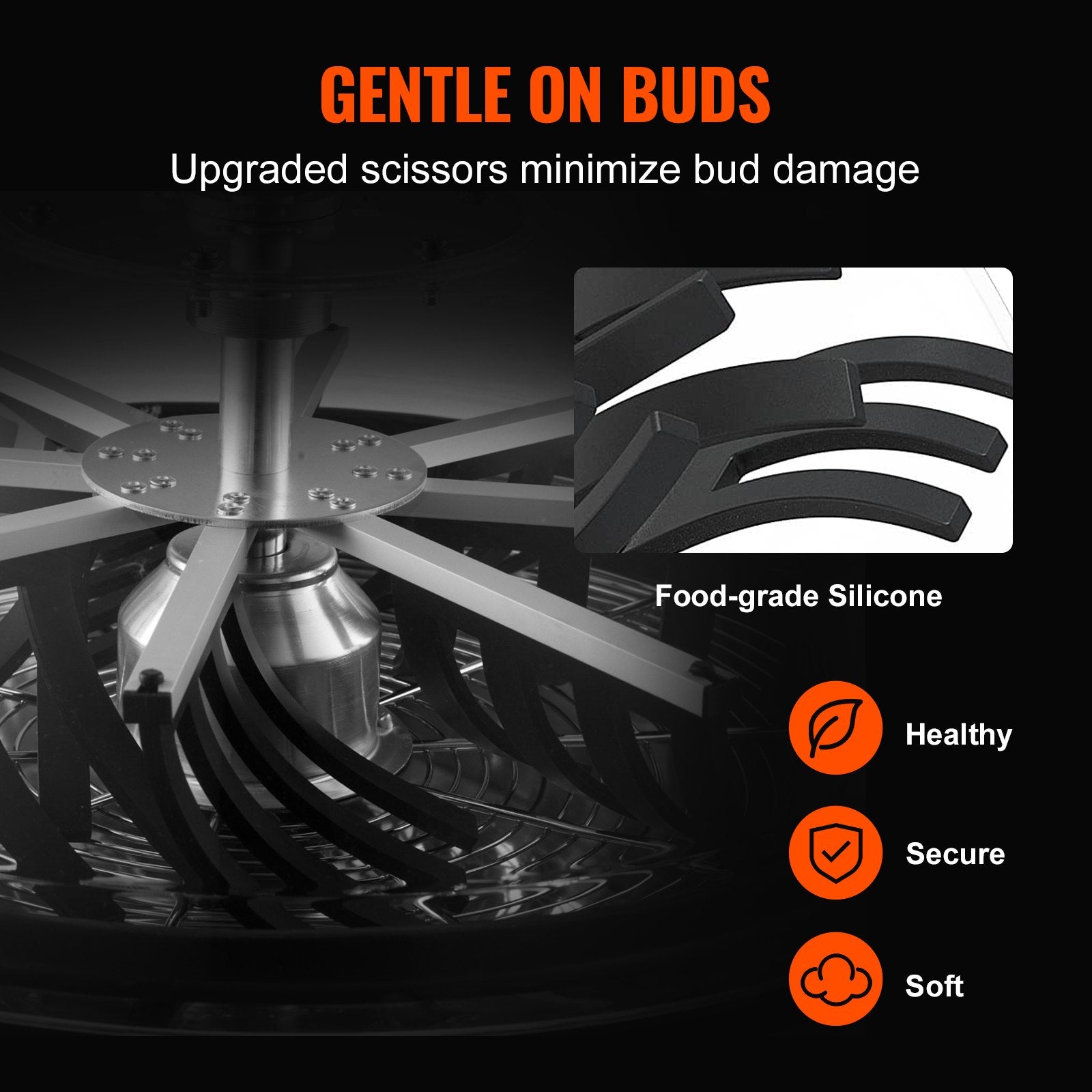With the clear lid of our leaf bowl trimmer, you can see the trimming in action from the front row. Watch your buds change before your eyes. The 19'' stainless steel trim bowl is convenient to clean up in time and provide a clean and non-stick pruning surface, while the rubber pad ensures stability, keeping the trimmer securely in place for flawless trims.
