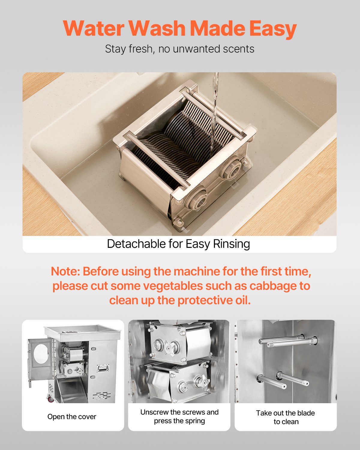 Our meat cutter machine comes with a widened and enlarged feed port for added security and convenience. It's great for cutting boneless meats like pork, lamb, beef, and fish, as well as soft vegetables like cabbage and mushrooms. Not suitable for bone-in meats, frozen foods, or hard vegetables like potatoes, carrots, and lotus roots.