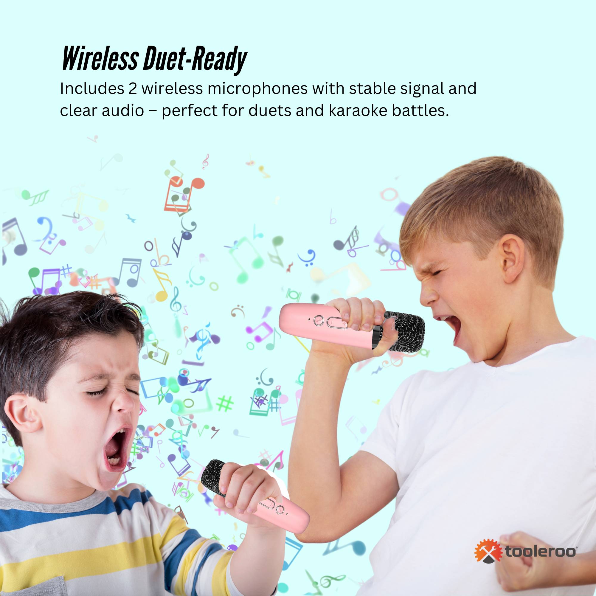 Bring the party to life with the Mini Karaoke Machine – the ultimate portable entertainment hub for music lovers of all ages. This compact yet powerful unit features dual wireless microphones, immersive voice-changing effects, vibrant LED lights, and multiple playback options including Bluetooth, TF card, and AUX. You can stream wirelessly, plug in with a standard 3.5mm male stereo plug, or load your favourite MP3/WAV tracks on a TF card (up to 32GB). Whether it’s a family night, birthday bash, or just singing in your room – the delivers hours of musical fun, anywhere, anytime.