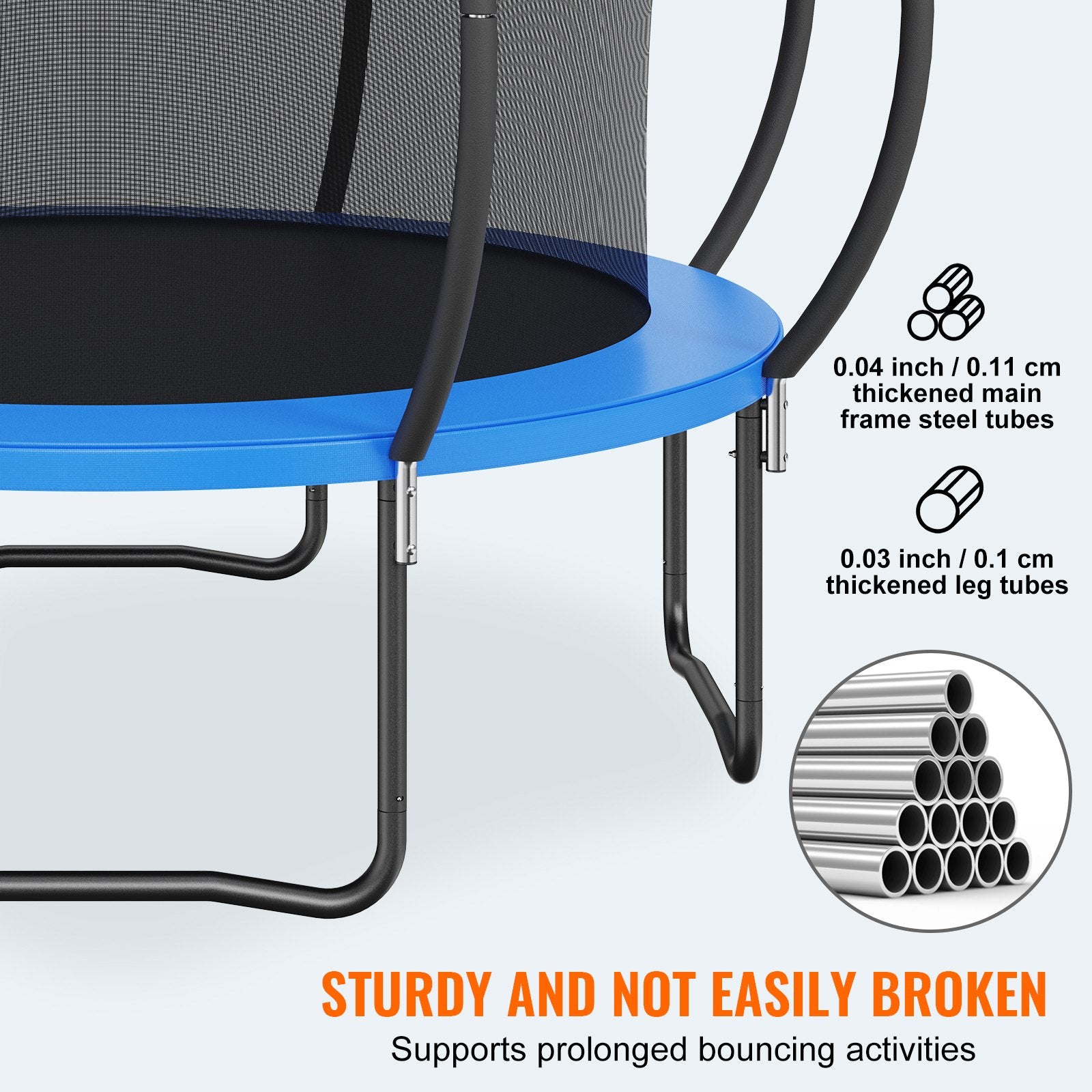 This recreational trampoline is made with upgraded high-quality materials. Its ring leg design with thickened steel tubes ensures even and firm support, making it resistant to bending even with prolonged use. The trampoline has undergone rigorous testing and can withstand a weight of around 330 lbs / 150 kg, making it suitable for children to bounce on.