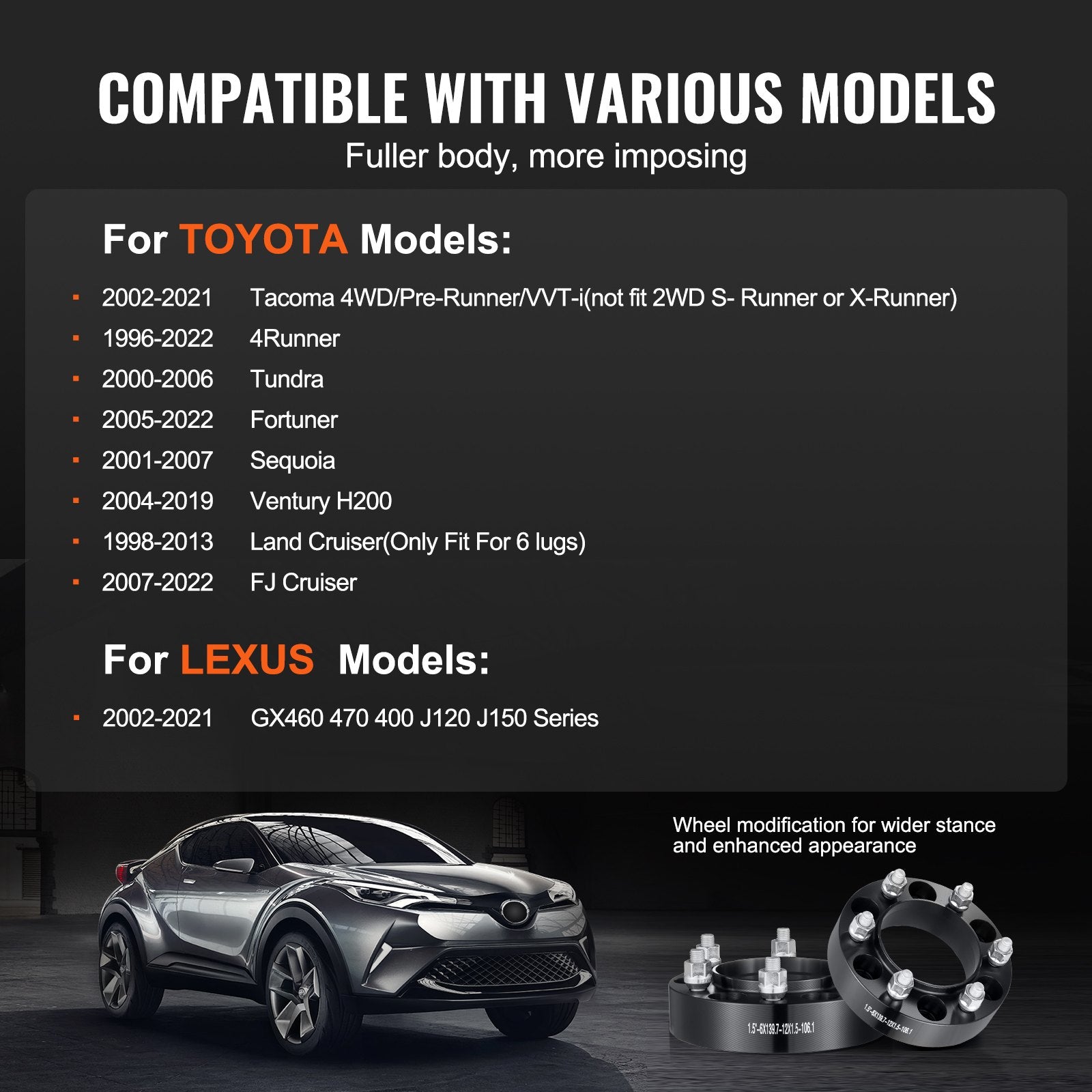These wheel spacers are compatible with many Toyota and Lexus vehicles from 1996 to 2022, including: Toyota: 2002-2021 Tacoma 4WD/Pre-Runner/VVT-i (not fit 2WD S-Runner or X-Runner), 1996-2022 4Runner, 2000-2006 Tundra, 2005-2022 Fortuner, 2001-2007 Sequoia, 2004-2019 Ventury H200, 1998-2013 Land Cruiser (Only Fit For 6 lugs), 2007-2022 FJ Cruiser. Lexus: 2002-2021 GX460 470 400 J120 J150 Series.