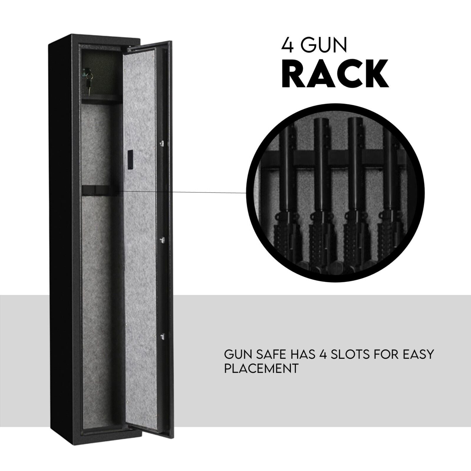The rifle safe can hold four rifles with or without scopes much more accessible and has an overall anti-static carpet design that can suppress the generation of static electricity. Prevent fire and explosion caused by static electricity, and effectively prevent the malfunction and damage of electronic equipment. The interior features soft EVA rest that can protect your gun.