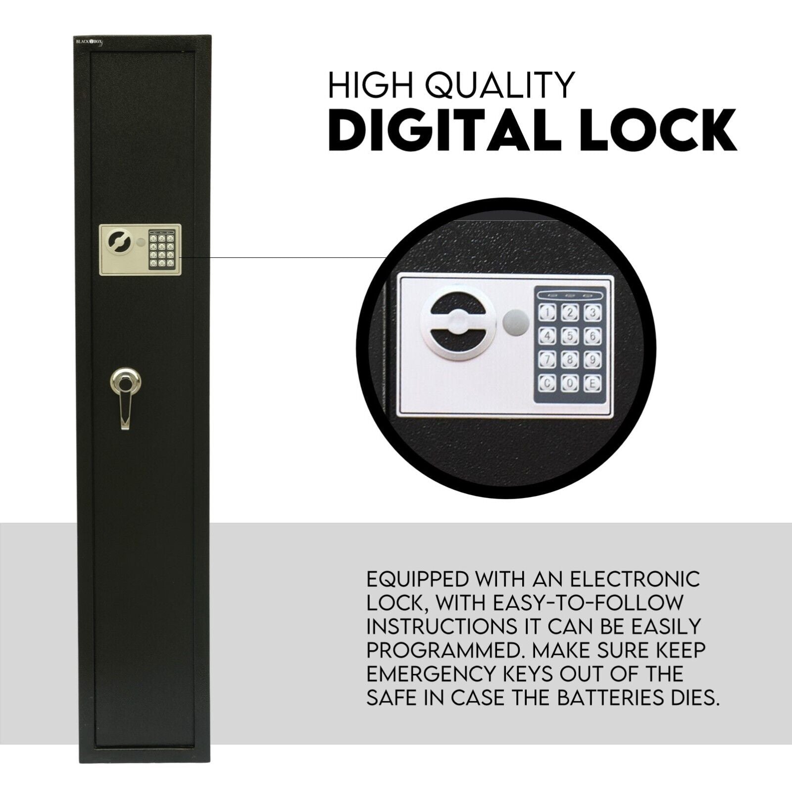 A reliable lock mechanism locks away with the electronic keypad by creating your own 3-8 digits code. You have to secure firearms away from kids and deter theft. For quick firearm access during emergencies, instantly unlock the safe with a reliable PIN code. Make sure to keep emergency keys out of the safe in case the batteries die.