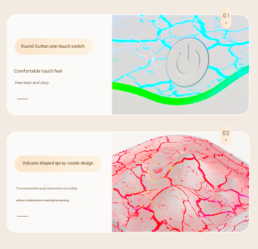 • Simulated Flame/Volcano Effect: Specialized lighting illuminates the mist, creating an impressive visual similar to a gentle volcanic eruption, especially with warm light settings.