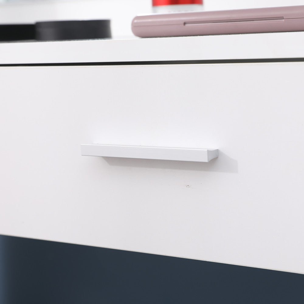 Two large drawers for storing cosmetics, perfumes, hair accessories and other beauty supplies.