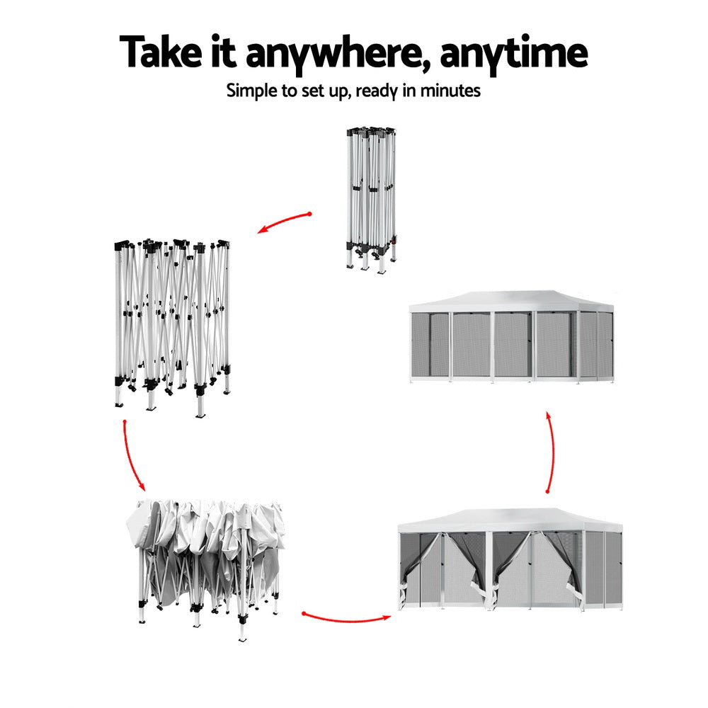 In your garden, at an outdoor BBQ or sports event, on your travelling vacation or on market days, our INSTAHUT Pop-up Gazebo is your ideal solution for instant cover outdoors. With a wide roof coverage of 300cm by 600cm, the exceptional cover is made of durable silver coating 210D Oxford fabric that is both UV and water resistant. Height can be easily adjusted with four pre-sets, ranging from 203cm to 268cm. It also features two zipped entrances and insect-proof mesh walls. Plus, the powder-coated steel frame, cross-bar frame work and steel supporting legs mean that this gazebo is no easy pushover from man or weather. The gazebo can be set up in minutes and kept away just as quickly in your car boot, van, trailer, garage or shed. Thanks to its portable design, quick and convenient hook and loop attachments, fast release and fasten rings and handy nylon inserts for hassle-free use.