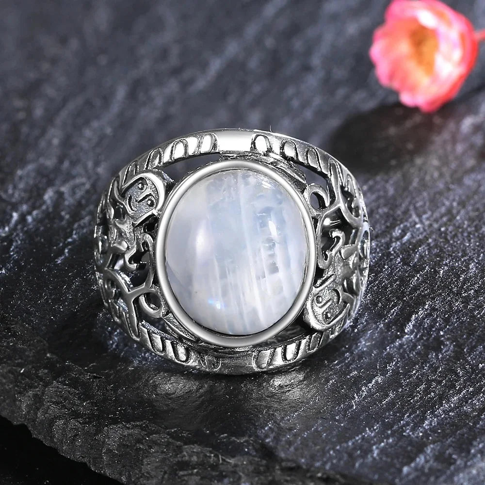 At its pinnacle rests a genuine Moonstone, cradled within a majestic crown setting, symbolizing the divine connection between earthly majesty and cosmic allure. Each stone is meticulously chosen for its captivating brilliance and ethereal charm, ensuring that every ring is a crown jewel in its own right. Embrace the magnificence of handcrafted artistry, where no two rings are alike, and each bears the mark of regal distinction.