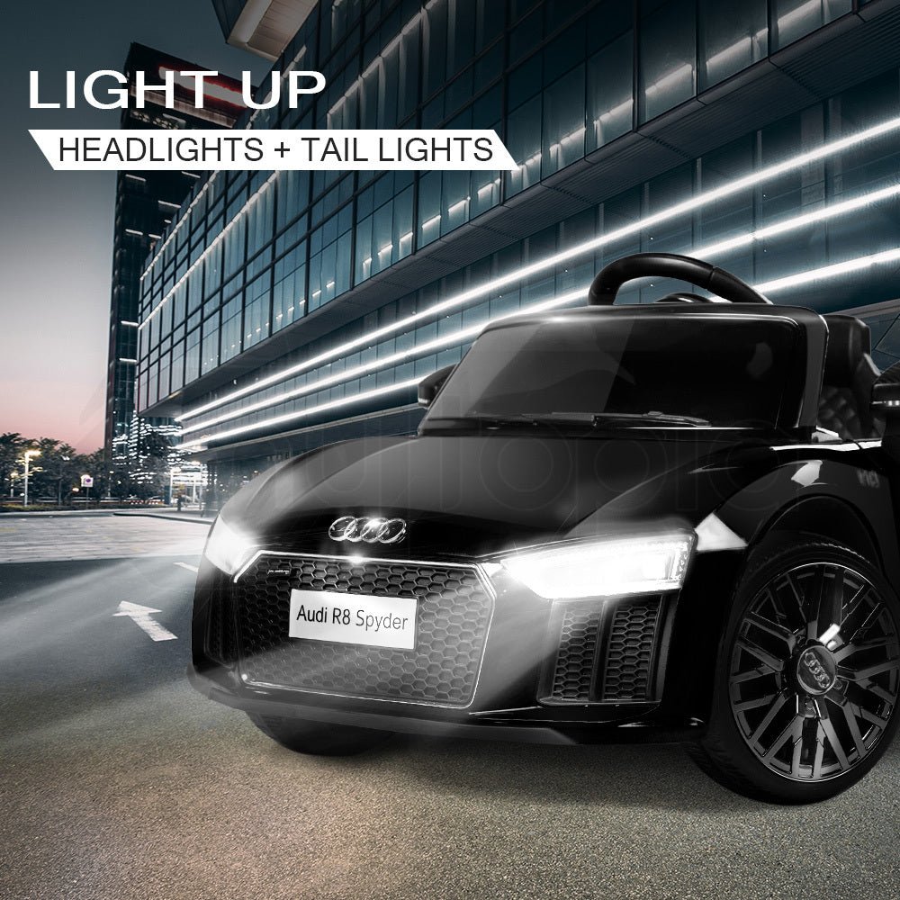 Presenting the R8 Spyder Ride-On Car, licensed by Audi. In the true spirit of the iconic sports car, this model boasts of luxurious and sporty detailing that characterise the actual full-size car. The headlights and rear lights, designed with unequivocally intricate detailing, light up along with the dashboard and gear selection.