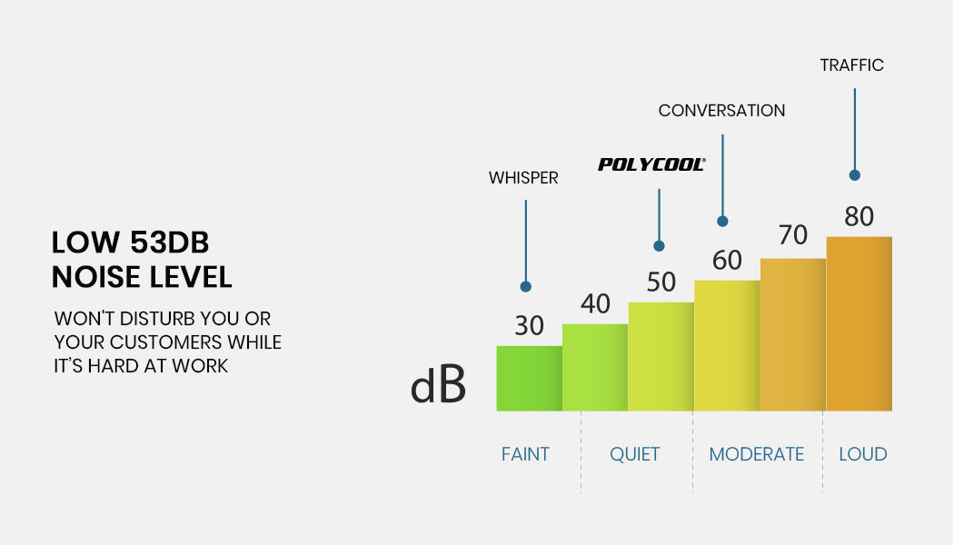 At 53dB the PolyCool operates at a level similar to a quiet conversation, so that your staff can focus on the job and your customers.