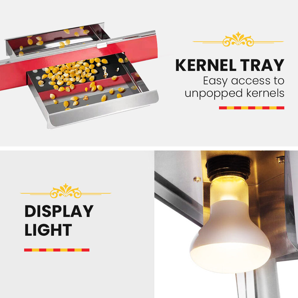 With the universal appeal of popcorn and delicious buttery aroma it’s an easy sell at community events, fairs, markets, and movie theatres–and, the Eurochef has all the features you need! Rear double doors and a bottom drop drawer provide convenient access points that make it a breeze to serve customers efficiently. A handy tray makes it easy to remove unpopped kernels after every session.