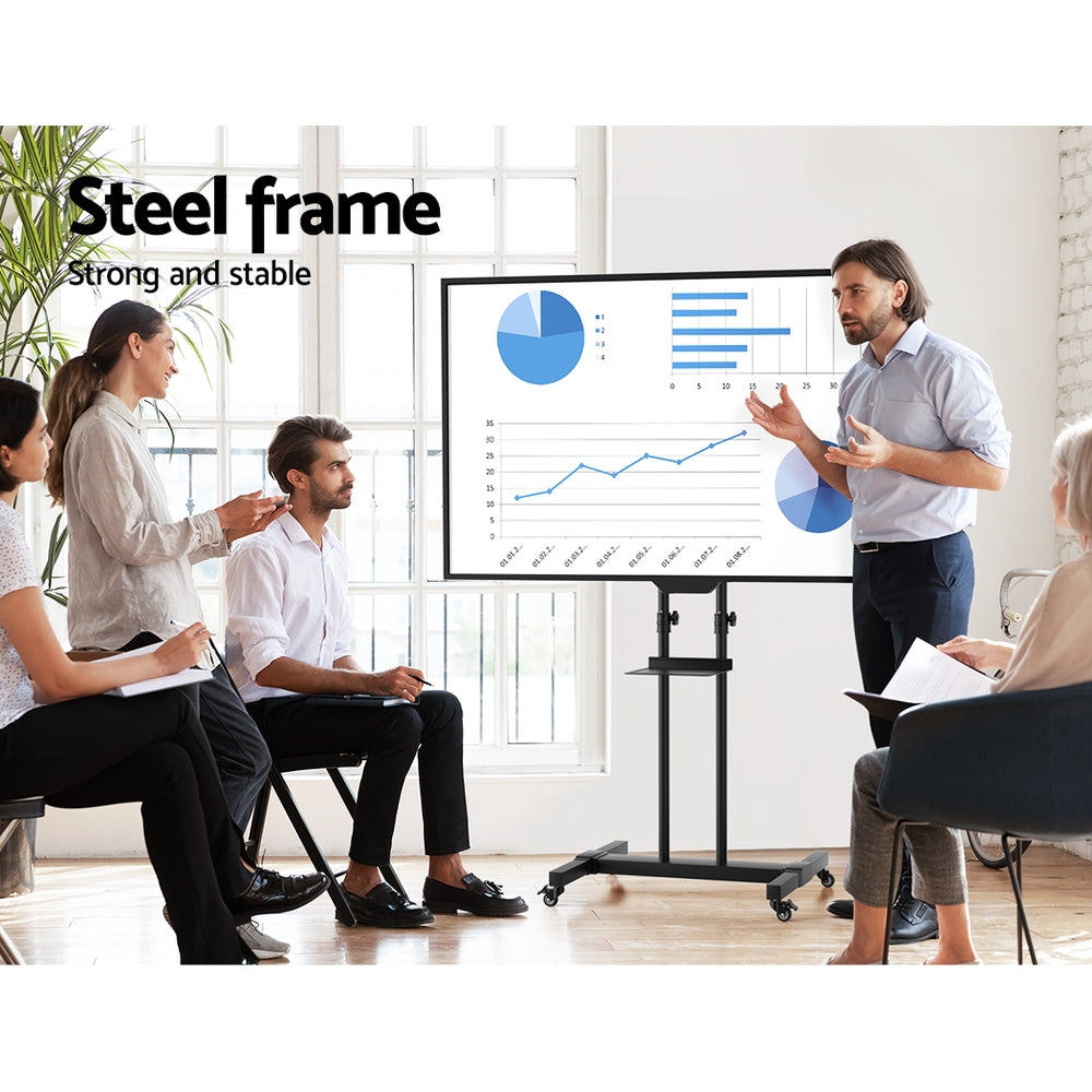 Entertainment is easy with our Artiss TV Floor Stand. With a seamless design that incorporates your TV screen and other multi-media equipment into one ensemble, the TV floor stand is simply exceptional. With a high-quality black powder-coated steel frame that has a weight capacity of 40kg, the TV floor stand can easily hold any TV screen between 23 inches and 65 inches. The stand comes with flexible mounting for various standard VESA measurements and is suitable for both curved and flat screens, so you don't have to worry about compatibility. The stand is set on rotating castor wheels with brakes so that you can move it to any room or location and keep it steady. It is also height adjustable between 126cm and 183cm so you will always have a comfortable line of sight. The tempered glass top shelf and integrated cable management system allow you to keep all your entertainment neatly in one place, while a safety bolt and sturdy base ensure total safety and a firm hold on your precious television screen. Enjoy mobile entertainment with the Artiss TV Floor Stand.