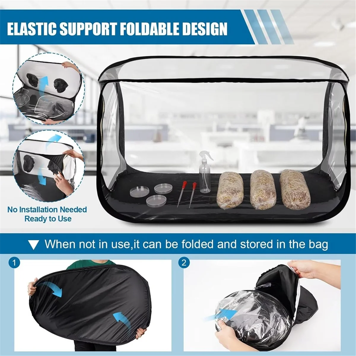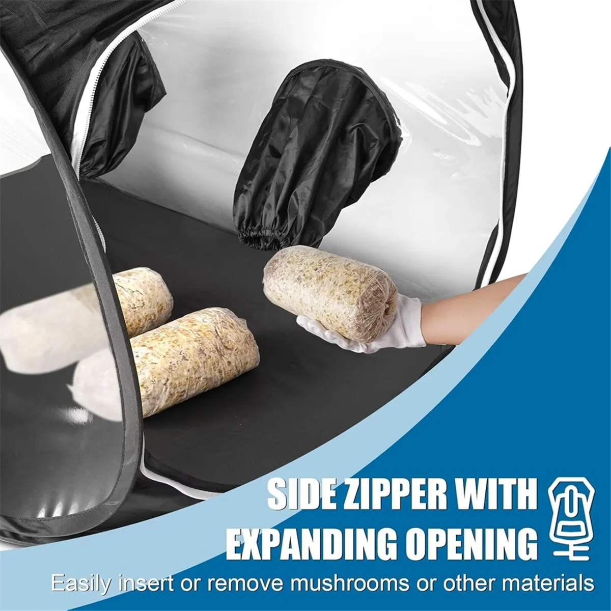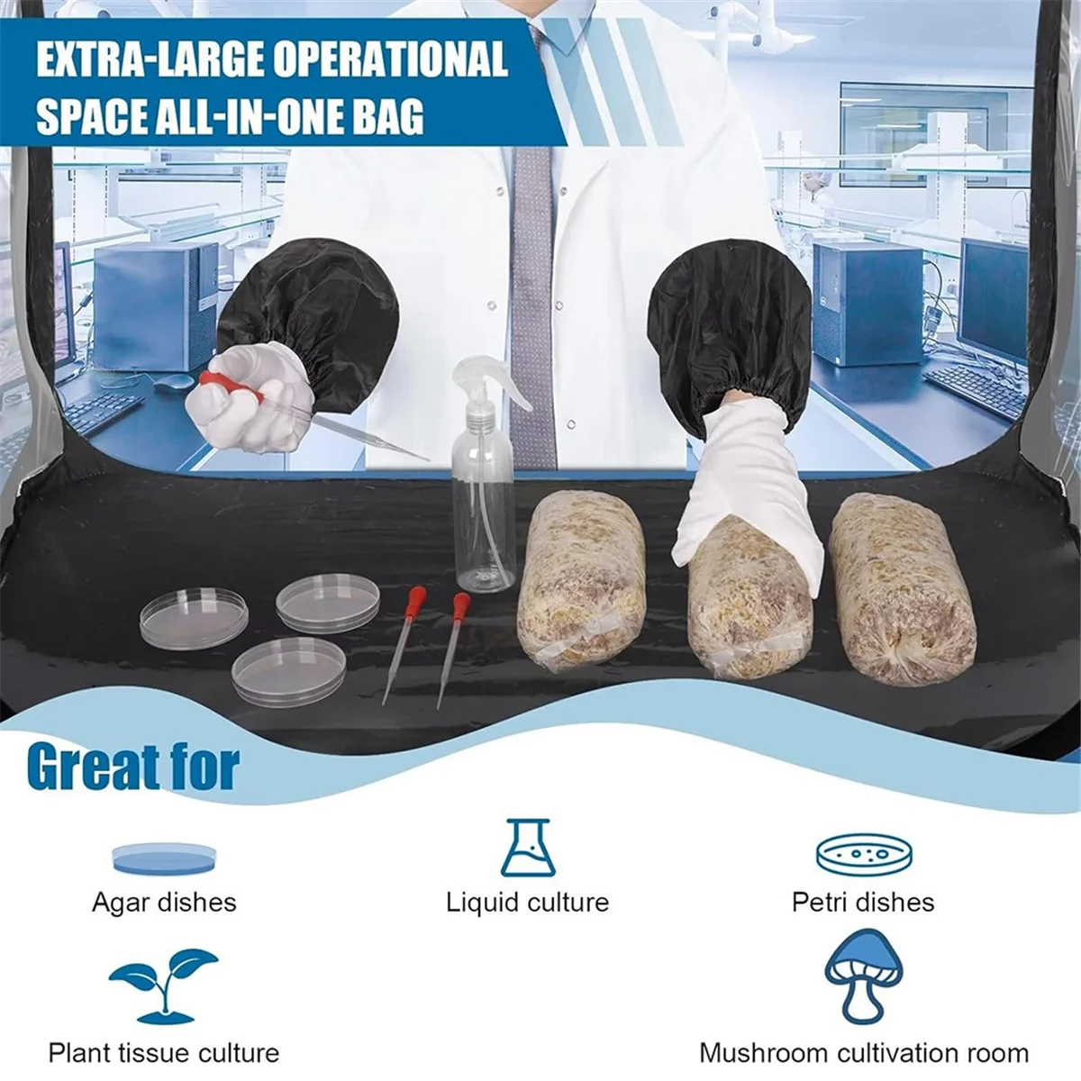Set up your workspace in a clean, stable area. Place your tools and mushroom bags inside, zip up the sides, and begin your inoculation or culture work. Keep the air inside still and clean for maximum success and yield.