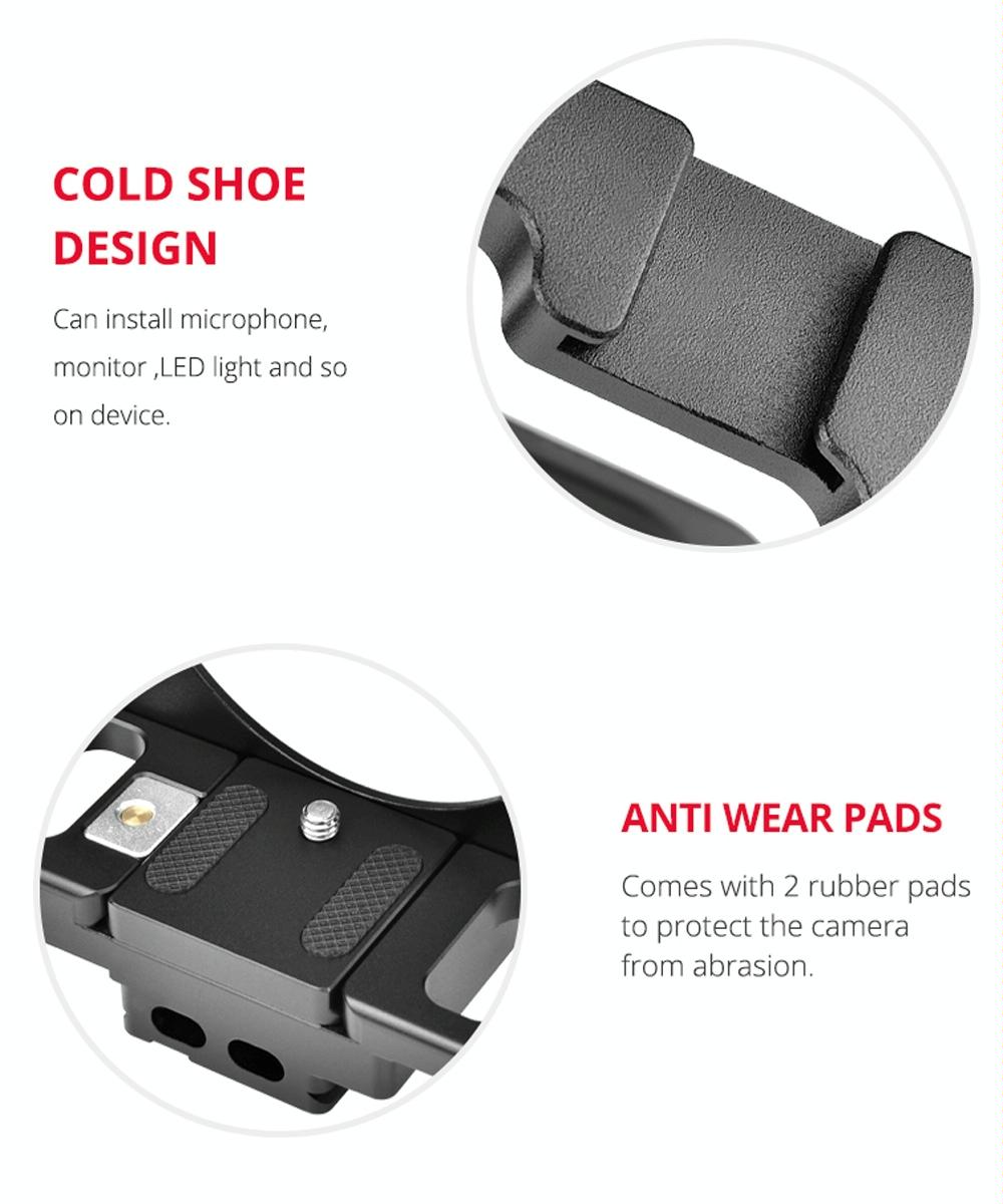 • 1/4 and 3/8 screw holes, cold shoe, and Arri stop holes interface.