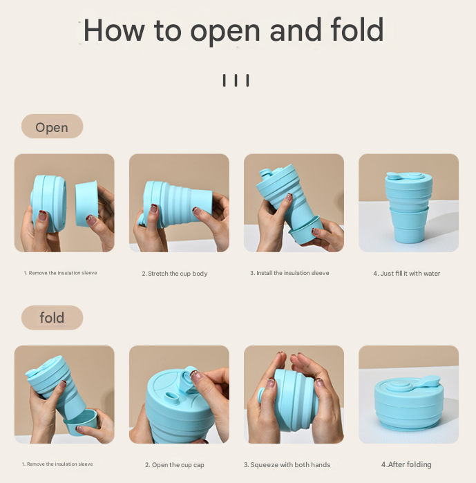 1. To Expand: Remove the heat-insulating sleeve. Gently pull the cup body upwards from the base or top rim until fully extended. Slide the heat-insulating sleeve onto the middle of the cup. Fill with your beverage.
