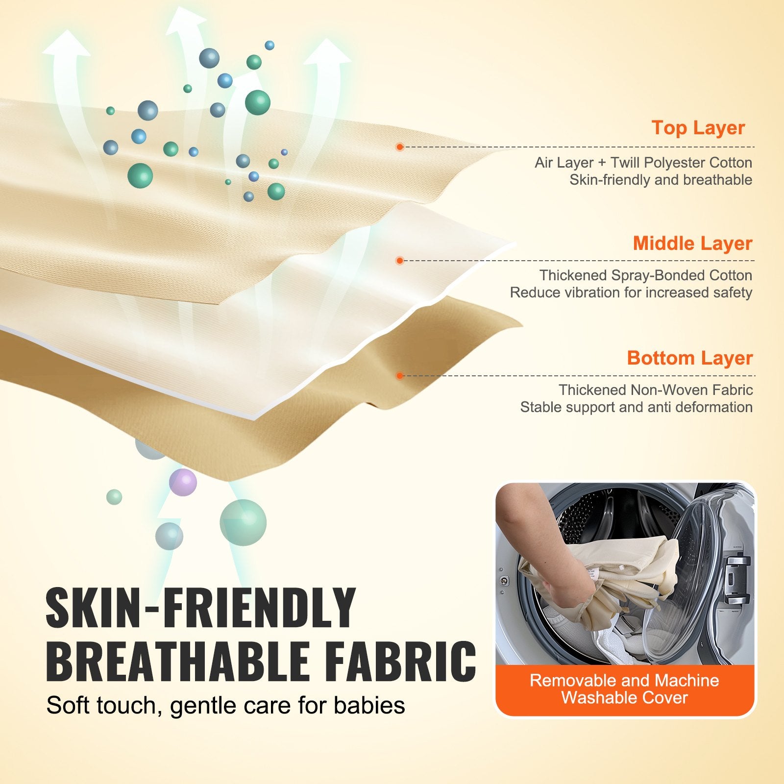 Our portable bouncer seat for babies is made from high-quality, soft cotton and non-woven fabric, skin-friendly and breathable. The removable, machine-washable cover simplifies cleaning and maintenance, so you can spend more time enjoying precious moments with your little one.
