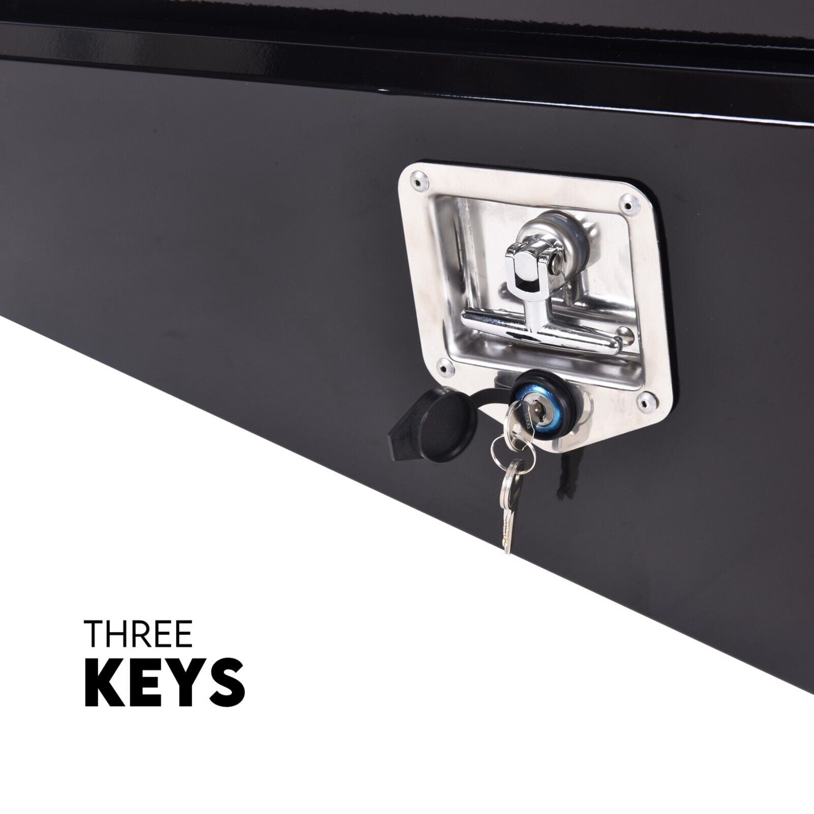Similar to its flat plate under tray toolbox and plate aluminium flat counterpart, it is built with super-heavy duty steel. Secure this black powder coated toolbox on the underbody of your truck or UTE for maximum strength and secure extra storage space.