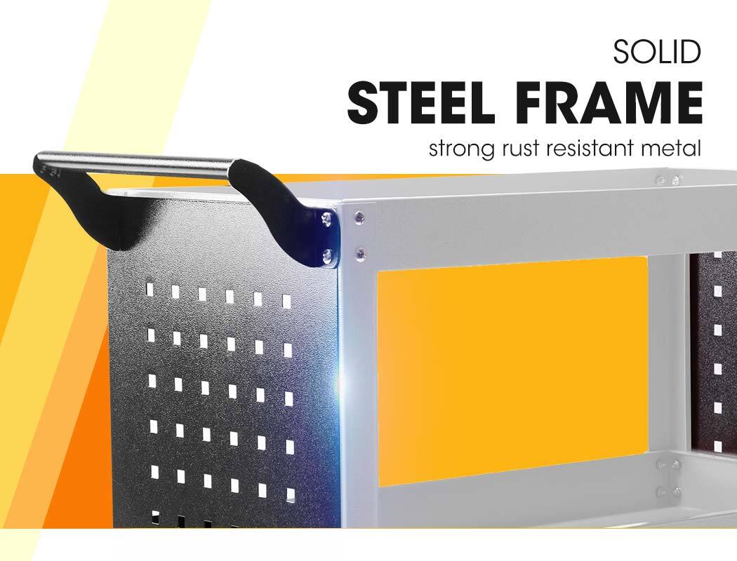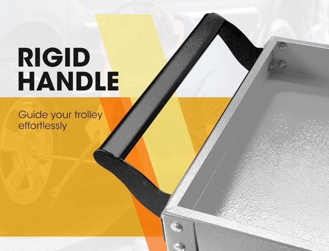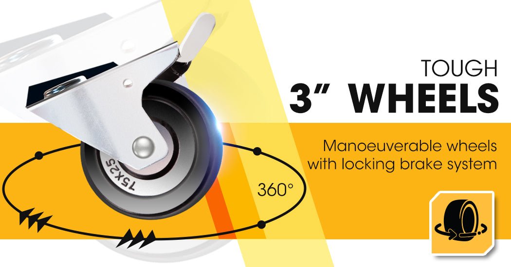 The BULLET 3-Tier Steel Tool Cart is a must-have for tackling jobs anywhere around your garage, warehouse or workshop. With a tough rust-resistant powder-coated steel frame, this portable tool cart is up to the task of rugged day-to-day use, and is easy to wipe clean if required. The solid durable wheels consist of two fixed front wheels to prevent ‘wandering steering’, and the rear swivel wheels can be foot-locked once you’re in position.